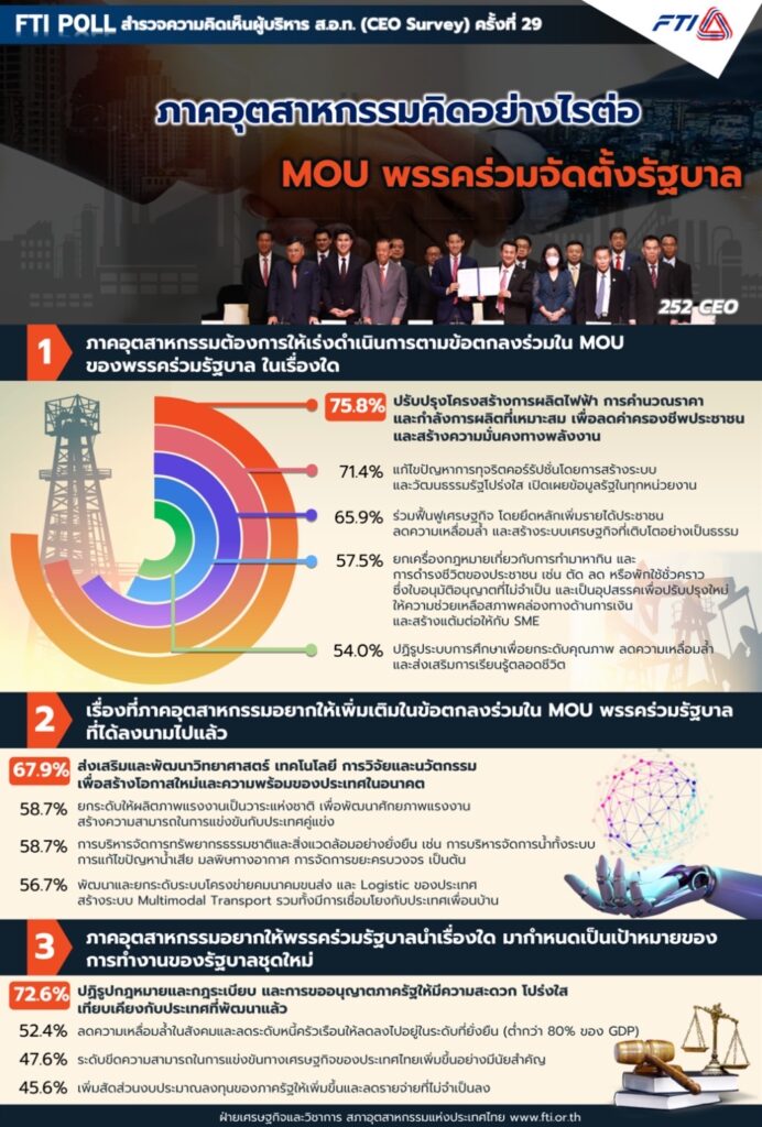 นายมนตรี มหาพฤกษ์พงศ์ รองประธานสภาอุตสาหกรรมแห่งประเทศไทย (ส.อ.ท.) เปิดเผยผลการสำรวจ FTI Poll ครั้งที่ 29 ในเดือนพฤษภาคม 2566 ภายใต้หัวข้อ “ภาคอุตสาหกรรมคิดอย่างไรต่อ MOU พรรคร่วมจัดตั้งรัฐบาล” ว่า ภายหลังจากที่ 8 พรรคการเมืองได้ลงนามบันทึกความเข้าใจร่วม (MOU) ในการจัดตั้งรัฐบาล เมื่อวันที่ 22 พฤษภาคม 2566 ซึ่งถือเป็นสิ่งใหม่ที่ไม่เคยเกิดขึ้นในทางการเมืองของไทยมาก่อน ข้อตกลงร่วมทั้ง 23 ข้อภายใต้MOU นั้น หลายเรื่องมีผลต่อการขับเคลื่อนเศรษฐกิจและอุตสาหกรรมไทย โดยจากผลสำรวจฯ ผู้บริหาร ส.อ.ท. ส่วนใหญ่ คาดหวังให้รัฐบาลใหม่เร่งดำเนินการในเรื่องการปรับปรุงโครงสร้างการผลิตไฟฟ้า การคำนวณราคา และกำลังการผลิตที่เหมาะสม เพื่อลดค่าครองชีพประชาชนและสร้างความมั่นคงทางพลังงาน ตามที่ระบุใน MOU โดยเร็ว ซึ่งเป็นประเด็นที่ภาคอุตสาหกรรมได้มีการเรียกร้องมาตลอดในช่วงที่ผ่านมา