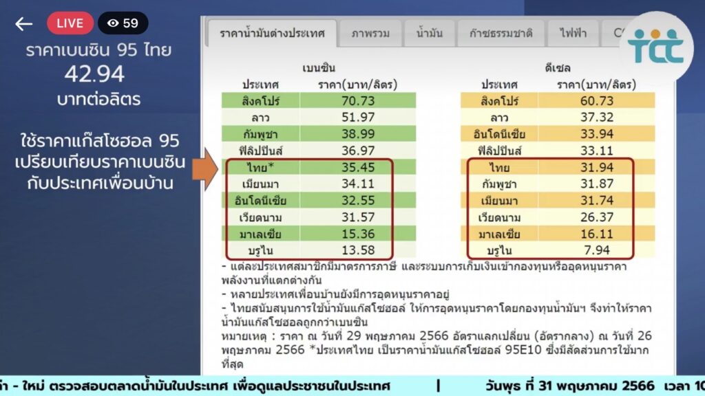 นายอิฐบูรณ์ อ้นวงษา รองเลขาธิการสำนักงานสภาผู้บริโภค กล่าวว่า ค่าการตลาดน้ำมันสำเร็จรูปในประเทศไทยระหว่างเดือนมกราคม-29 พฤษภาคม 2566 ค่าการตลาดแก๊สโซฮอล์ 95 เฉลี่ย 5 เดือนแรกของปี 2566 อยู่ที่ 3.29 บาทต่อลิตร ค่าการตลาดน้ำมันดีเซลเฉลี่ย 5 เดือนแรกของปี 2566 อยู่ที่ 1.79 บาทต่อลิตร ปริมาณการใช้น้ำมันเบนซิน 30 ล้านลิตรต่อวัน ปริมาณการใช้น้ำมันดีเซล 70 ล้านลิตรต่อวัน ทั้งนี้มีค่าใช้จ่ายที่ผู้ใช้น้ำมันต้องจ่ายให้ค่าการตลาดที่ไม่เป็นธรรมรวม 5 เดือน โดยกลุ่มเบนซินต้องจ่าย 193 ล้านบาท กลุ่มดีเซล 100 ล้านบาท ซึ่งราคาน้ำมันของไทย ณ วันที่ 29 พฤษภาคม 2566 น้ำมันเบนซินมีราคาลิตรละ 35.45 บาท ถือว่ามีราคาแพงกว่าประเทศเพื่อนบ้านอย่าง เมียนมา ที่ราคาเบนซินลิตรละ 34.11 บาท อินโดนีเซีย เบนซินลิตรละ 32.55 บาท เวียดนาม เบนซินลิตรละ 31.57 บาท มาเลเซีย เบนซินลิตรละ 15.36 บาท บรูไน เบนซินลิตรละ 13.58 บาท ส่วนราคาน้ำมันดีเซลของไทยลิตรละ 31.94 บาท แพงกว่าประเทศเพื่อนบ้านอย่าง กัมพูชา ลิตรละ 31.87 บาท เมียนมา 31.74 บาท เวียดนาม26.37 บาท มาเลเซีย 16.11 บาท และบรูไน 7.94 บาท