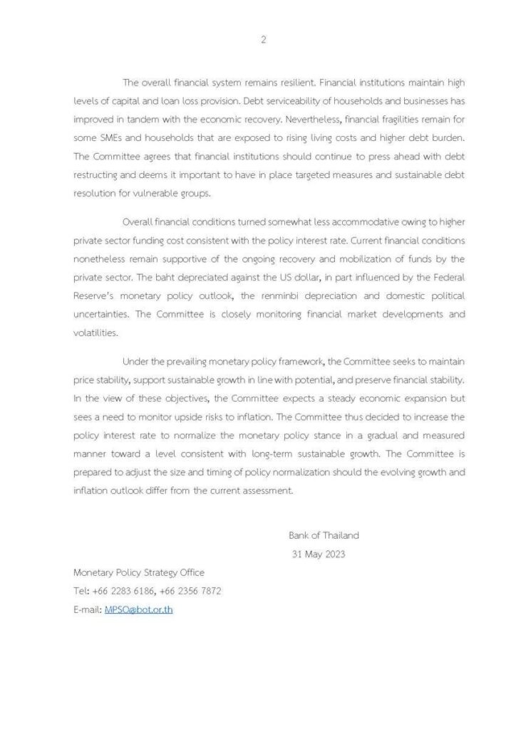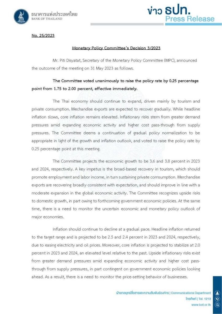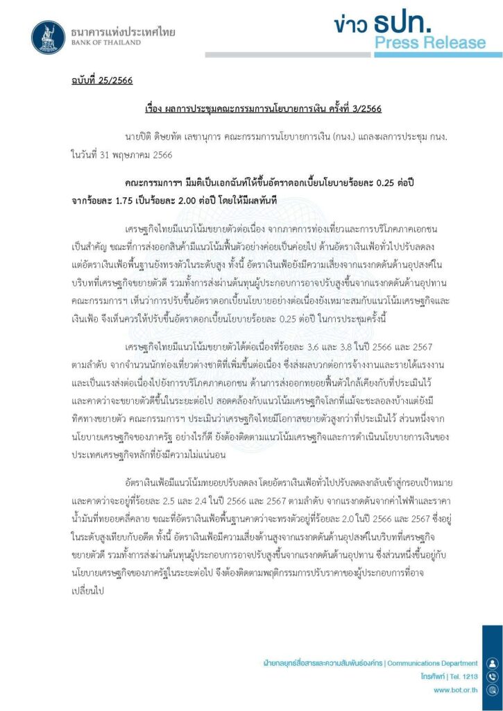 กรุงเทพฯ 31 พ.ค.- ผลการประชุม กนง. ครั้งที่ 3/66 คณะกรรมการฯ มีมติเป็นเอกฉันท์ให้ขึ้นอัตราดอกเบี้ยนโยบาย 0.25% ต่อปี จาก 1.75% เป็น 2.00% ต่อปี โดยให้มีผลทันที