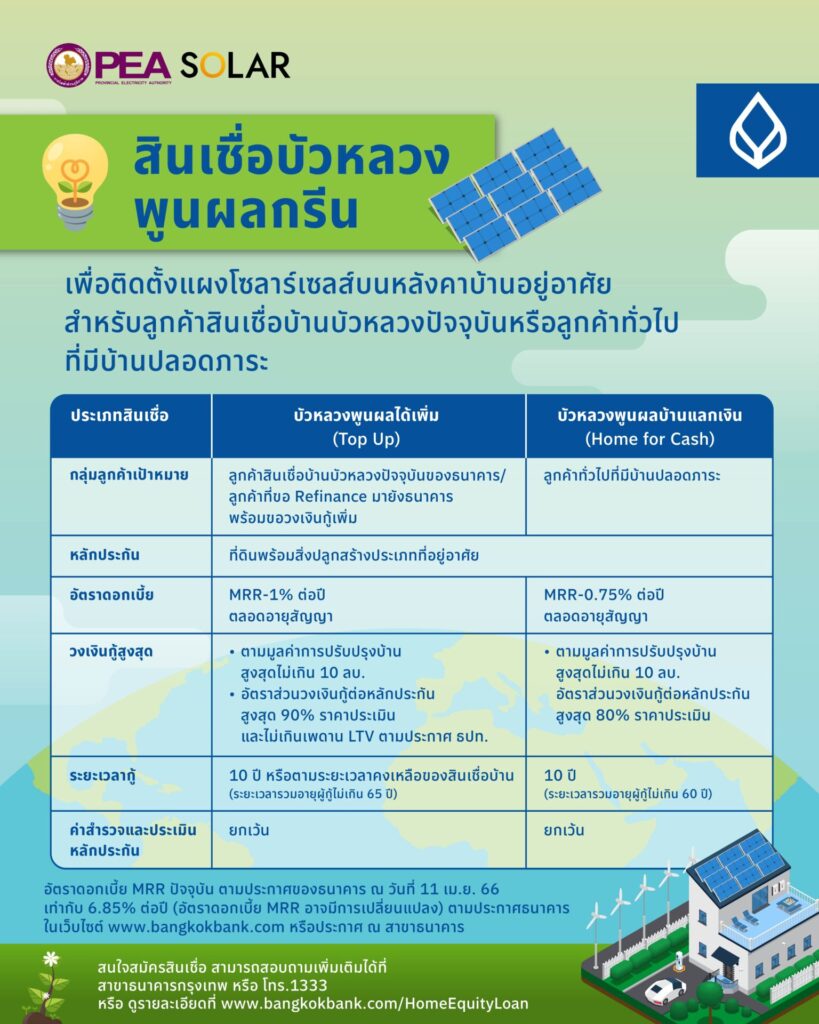 น.ส.พจณี คงคาลัย ผู้ช่วยผู้จัดการใหญ่ ธนาคารกรุงเทพ จำกัด (มหาชน) ร่วมกับ การไฟฟ้าส่วนภูมิภาคจัดโครงการ “สนับสนุนการให้สินเชื่อสำหรับลูกค้าบ้านอยู่อาศัย ที่ใช้บริการติดตั้งแผงโซลาร์เซลล์บนหลังคา (Solar Rooftop) กับ กฟภ.” มอบแคมเปญพิเศษ “สินเชื่อบัวหลวงพูนผลกรีน” ตอบโจทย์ลูกค้าที่ต้องการขอกู้เพื่อนำเงินปรับปรุงบ้านในรูปแบบพลังงานสะอาด หรือพลังงานทดแทน โดยสามารถนำบ้านที่ปลอดภาระมาเป็นหลักทรัพย์ค้ำประกัน รวมถึงกรณีเป็นลูกค้าสินเชื่อบ้านที่ยังผ่อนกับธนาคารกรุงเทพ หรือ ลูกค้าที่รีไฟแนนซ์มายังธนาคารพร้อมขอวงเงินกู้เพิ่ม รับข้อเสนอพิเศษ พิเศษต่อที่ 1 อัตราดอกเบี้ยพิเศษเริ่มต้น MRR-1% ต่อปี ตลอดอายุสัญญา ผ่อนชำระสบาย ๆ นานสูงสุด 10 ปี ฟรี!ค่าสำรวจและประเมินหลักประกัน และ พิเศษต่อที่ 2 ลูกค้า 200 ท่านแรกที่อนุมัติและเบิกใช้วงเงินสินเชื่อตั้งแต่ 500,000 บาทขึ้นไป ภายใน 30 มิถุนายน 2566 รับเพิ่ม E-Voucher by Central Group มูลค่า 2,000 บาทอีกด้วย