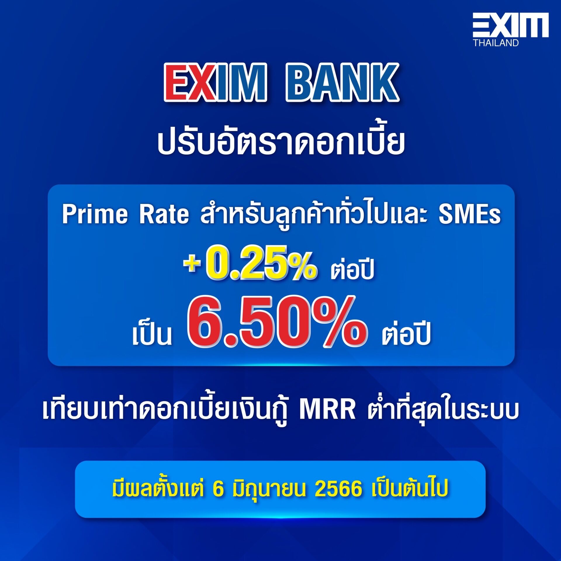 ทั้งนี้เพื่อช่วยให้การฟื้นตัวของเศรษฐกิจไทยเป็นไปอย่างมีเสถียรภาพ EXIM BANK จึงประกาศปรับเพิ่มอัตราดอกเบี้ย Prime Rate ร้อยละ 0.25 ต่อปี จากร้อยละ 6.25 ต่อปี เป็นร้อยละ 6.50 ต่อปี ยังคงเป็นอัตราดอกเบี้ยเงินกู้ลูกค้ารายย่อยชั้นดีที่ต่ำที่สุดในระบบ มีผลตั้งแต่วันที่ 6 มิถุนายน 2566 เป็นต้นไป