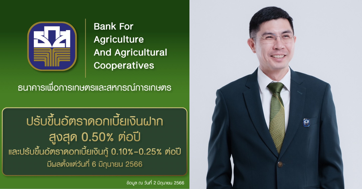 นายฉัตรชัย ศิริไล ผู้จัดการธนาคารเพื่อการเกษตรและสหกรณ์การเกษตร (ธ.ก.ส.) เปิดเผยว่า ตามที่คณะกรรมการนโยบายการเงิน (กนง.) มีมติปรับขึ้นอัตราดอกเบี้ยนโยบายร้อยละ 0.25 ต่อปี จากอัตราดอกเบี้ยนโยบายที่ร้อยละ 1.75 ต่อปี มาอยู่ที่ร้อยละ 2.00 ต่อปี โดยให้มีผลตั้งแต่วันที่ 31 พฤษภาคม 2566 และเพื่อให้สอดคล้องกับอัตราดอกเบี้ยนโยบายของธนาคารแห่งประเทศไทยและการปรับขึ้นอัตราดอกเบี้ยของตลาด ธ.ก.ส. จึงได้ปรับขึ้นอัตราดอกเบี้ยเงินฝาก ร้อยละ 0.05-0.50 ต่อปี เพื่อส่งเสริมการออมและเพิ่มผลตอบแทนให้สอดคล้องกับอัตราผลตอบแทนของธนาคารพาณิชย์และสถาบันการเงินเฉพาะกิจของรัฐ (SFIs)