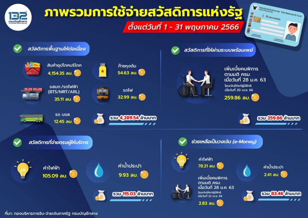 สำหรับเดือนพฤษภาคม 2566 กรมบัญชีกลางขอรายงานผลการจ่ายเงินสวัสดิการแห่งรัฐ ข้อมูลตั้งแต่วันที่ 1- 31 พฤษภาคม 2566 ดังนี้