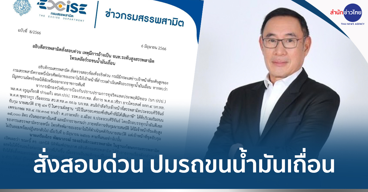 กรุงเทพฯ 7 มิ.ย.- อธิบดีสรรพสามิตสั่งสอบด่วน เหตุอ้างเป็นผู้บริหารระดับสูงสรรพสามิต โทรเคลียร์รถขนน้ำมันเถื่อน ผิดจริง ให้พักหรือออกจากราชการทันที