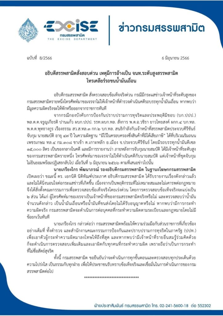 ขณะนี้ นายเอกนิติ นิติทัณฑ์ประภาศ อธิบดีกรมสรรพสามิตได้รับรายงานเรื่องดังกล่าวแล้วและไม่ได้นิ่งนอนใจต่อกระแสข่าวที่เกิดขึ้น เนื่องจากเป็นพฤติกรรมที่ไม่เหมาะสมและไม่เคารพต่อกฎหมาย จึงได้สั่งตั้งคณะกรรมการเพื่อตรวจสอบข้อเท็จจริงโดยเร่งด่วน โดยการตรวจสอบข้อเท็จจริงจะแบ่งเป็น 2 ส่วน ได้แก่ ผู้โทรศัพท์มาขอเจรจาเป็นเจ้าหน้าที่ของกรมสรรพสามิตจริงหรือไม่ และตรวจสอบว่าน้ำมันจำนวนดังกล่าว เป็นน้ำมันเถื่อนหรือน้ำมันที่ขนส่งโดยไม่ได้รับอนุญาตหรือไม่ หากพบว่ามีการกระทำ ความผิดจริง กรมสรรพสามิตจะดำเนินการต่อบุคคลที่กระทำความผิดตามระเบียบและกฎหมายโดยไม่มีข้อยกเว้นทันที