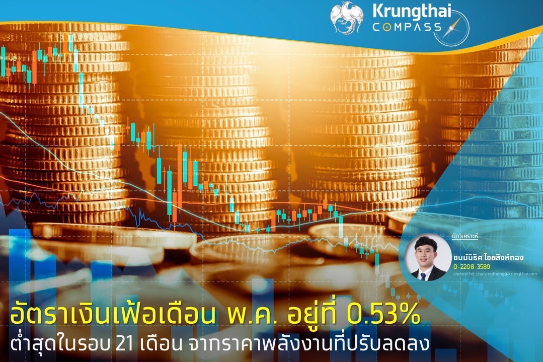 นายชนม์นิธิศ ไชยสิงห์ทอง นักวิเคราะห์ Krungthai COMPASS เปิดเผยว่า อัตราเงินเฟ้อทั่วไปเดือน พ.ค. ขยายตัว0.53%YoY ชะลอลงจากเดือนก่อนที่ขยายตัว 2.67%YoY ต่ำกว่านักวิเคราะห์คาดไว้ที่ 1.7% ต่ำสุดในรอบ 21 เดือนจากราคาหมวดพลังงาน ที่กลับมาหดตัวครั้งแรกในรอบ 27 เดือน ที่ -9.55%YoY ตามราคาน้ำมันเชื้อเพลิงที่ลดลงและค่ากระแสไฟฟ้าที่ลดลงจากการปรับลดค่า Ft ในรอบเดือน พ.ค.-ส.ค.2566 ขณะที่หมวดอาหารสดขยายตัว4.70%YoY ชะลอลงจากเดือน เม.ย. ที่ 5.50%YoY จากราคาเนื้อสุกรที่ปรับลดลง