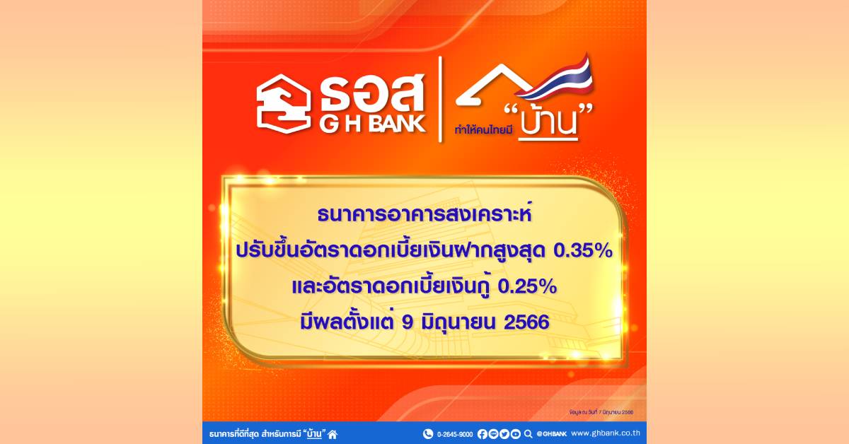 พร้อมกันนี้ ธอส. ในฐานะสถาบันการเงินของรัฐ ที่มีพันธกิจ “ทำให้คนไทยมีบ้าน” ยังมีสินเชื่ออัตราดอกเบี้ยต่ำ สำหรับผู้ที่ต้องการมีที่อยู่อาศัยเป็นของตนเองอีกด้วย โดยการปรับขึ้นอัตราดอกเบี้ยดังกล่าว ให้มีผลบังคับใช้ตั้งแต่วันที่ 9 มิถุนายน 2566 เป็นต้นไป ผู้ที่สนใจสอบถามรายละเอียดเพิ่มเติมได้ที่ ธอส.ทุกสาขาทั่วประเทศ G H Bank Call Center โทร 0-2645-9000 หรือ Facebook Fanpage ธนาคารอาคารสงเคราะห์ และติดตามข่าวสารของธนาคาร ได้ที่ Mobile Application : GHB ALL GEN และ www.ghbank.co.th . – สำนักข่าวไทย