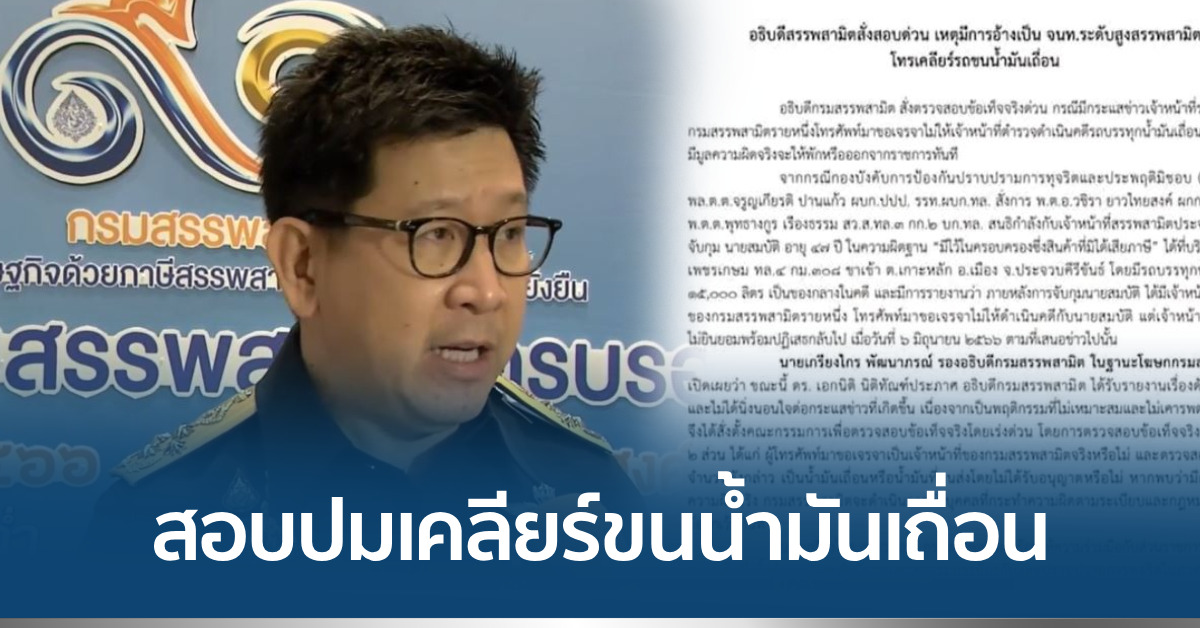 กรุงเทพฯ 7 มิ.ย. – อธิบดีกรมสรรพสามิต สั่งตั้งกรรมการสอบกรณีมีผู้กล่าวหาผู้บริหารกรมสรรพสามิต โทรเคลียร์รถขนน้ำมันเถื่อน ขอให้ปล่อยตัว ยืนยันหากผิดจริง พร้อมสั่งพักหรือออกจากราชการทันที