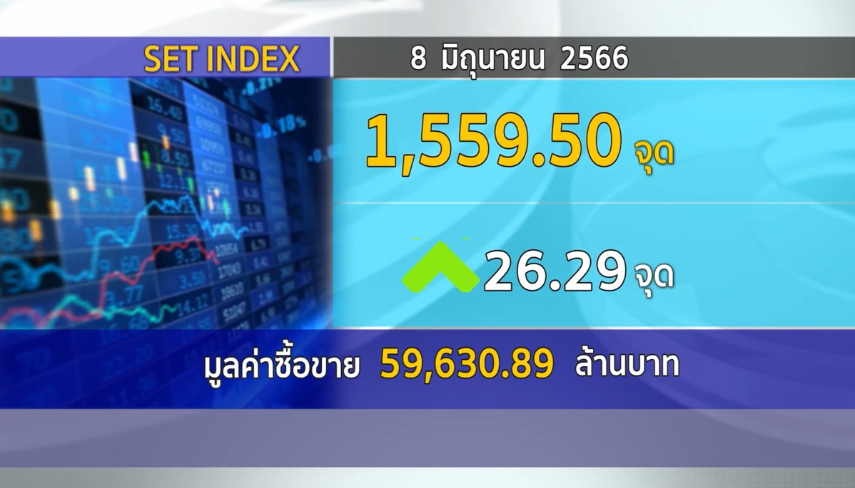 กทม. 8 มิ.ย.-SET ปิดวันนี้ที่ 1,559.50 จุด เพิ่มขึ้น 26.29 จุด (+1.71%) มูลค่าการซื้อขาย 59,630.89 ล้านบาท