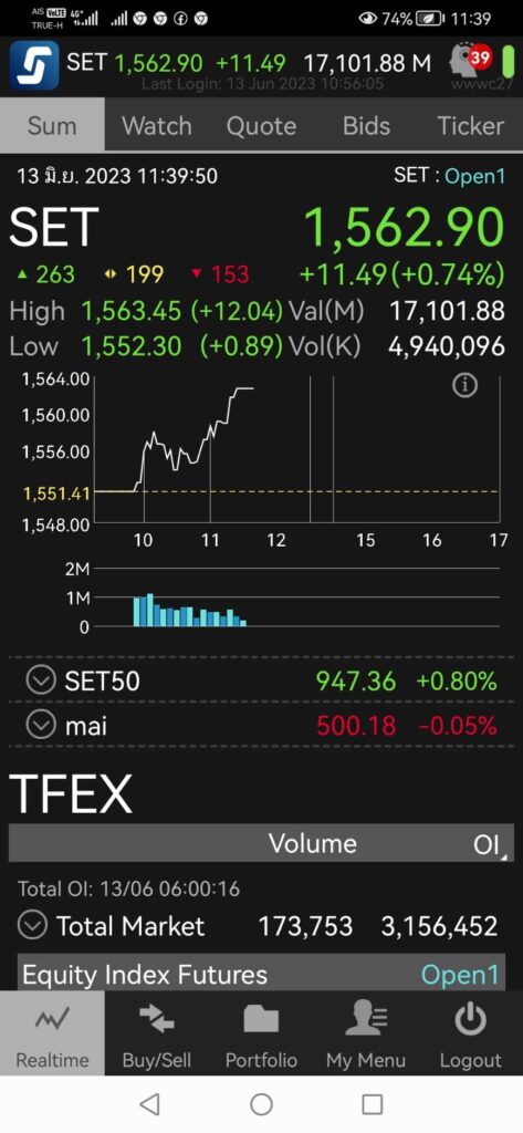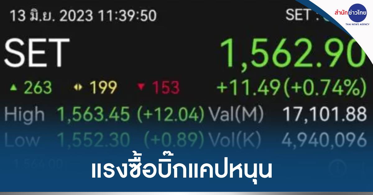 เมื่อเวลา 11.39 น. ดัชนี SET อยู่ที่ 1,562.90 จุด เพิ่มขึ้น 11.49 จุด (+0.74%) มีแรงซื้อหุ้นกลุ่มอิเล็กทรอนิกส์ที่ปรับตัวขึ้นตามทิศทางตลาดหุ้นสหรัฐ โดยเฉพาะหุ้นกลุ่มเทคโนโลยี ส่วนหุ้นกลุ่มพลังงานปรับตัวขึ้นหลังราคาน้ำมันดิบเริ่มฟื้นตัว และยังมีแรงซื้อกลับในหุ้นกลุ่มทุนใหญ่ที่วานนี้ปรับตัวลงแรง ซึ่งเป็นผลกระทบจากการเมืองในประเทศ