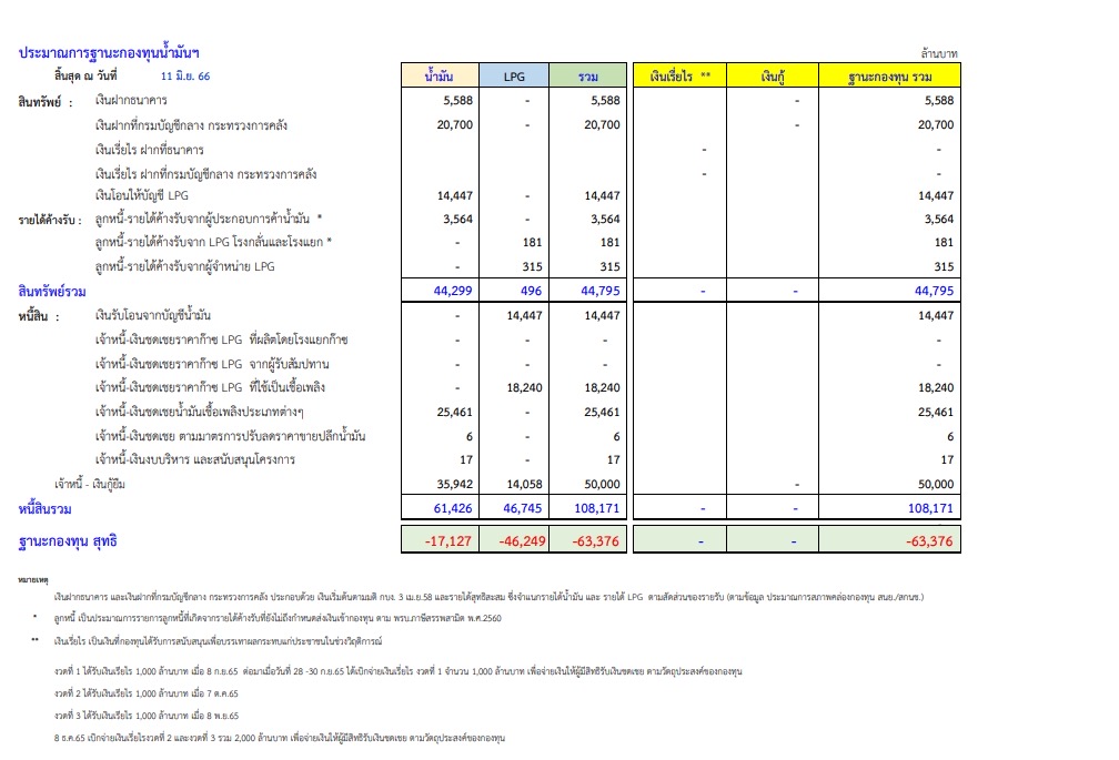 ล่าสุดจากราคาน้ำมันดีเซลลดลง กองทุนฯ มีการกู้เงินเสริมสภาพคล่อง ก็ส่งผลให้ฐานะกองทุนน้ำมันฯ 11 มิ.ย. 66 ติดลบเพียง 63,376 ล้านบาท แยกเป็นบัญชีน้ำมันติดลบ 17,127 ล้านบาท บัญชี แอลพีจี ติดลบ 46,249 ล้านบาทโดยในส่วนของก๊าซหุงต้มนั้น ต้องจับตาดูว่า จะขยับราคาอีกหรือไม่ โดยคณะกรรมการบริหารนโยบายพลังงาน หรือกบง.มีมติคงราคาก๊าซหุงต้ม LPG ที่ราคา 423 บาท/ถัง 15 กิโลกรัม เริ่ม 1 เม.ย.-30 มิ.ย.66 และขอให้ ปตท. คงราคาก๊าซรถยนต์ NGV ไว้ที่ 17.59 บาท/กิโลกรัม เริ่ม 16 มี.ค.-15 มิ.ย.66