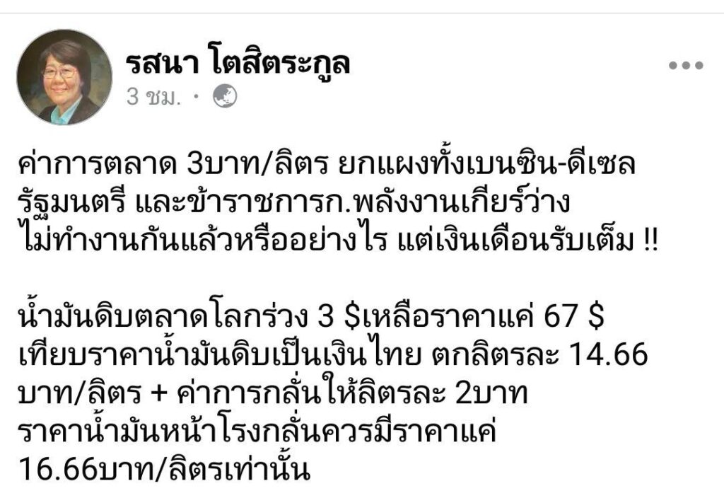 “นายสุพัฒนพงศ์ พันธ์มีเชาว์ รมว.พลังงานประกาศตั้งแต่ 14 กพ.66 ว่า คณะกรรมการบริหารนโยบายพลังงาน(กบง.)ไฟเขียวค่าการตลาดกลุ่มเบนซินอยู่ที่ 2บาท/ลิตร โดยให้กลับไปใช้ค่าการตลาดที่เหมาะสมของปี 63 แสดงว่าค่าการตลาดดีเซลควรอยู่ที่ 1.65 บาท/ลิตร แต่ปัจจุบัน กบง.ปล่อยไม่มีการกำกับดูแลเลย ผู้บริโภคถูกเอาเปรียบ ใน5เดือนแรกของปีนี้ (ม.ค.-พ.ค.) คาดผู้ค้าน้ำมันได้กำไรเกินสมควรจากค่าการตลาดสูงถึง 300 ล้านบาท ข้าราชการไม่ควรเกียร์ว่าง” นส.รสนา กล่าว
