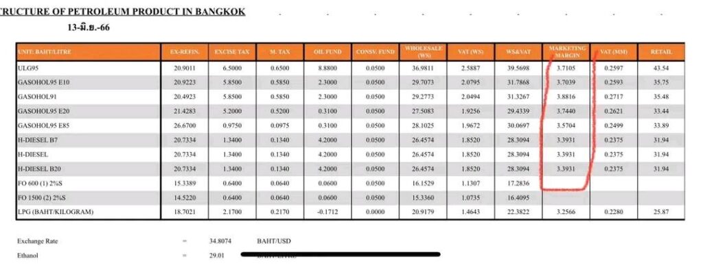 นส.รสนา โตสิตระกูล อนุกรรมการด้านบริการสาธารณะพลังงาน และสิ่งแวดล้อม สภาองค์กรของผู้บริโภค ระบุว่าค่าการตลาดวันนี้ ( 13 มิ.ย.66) ทั้งกลุ่มเบนซิน ดีเซล สูงยกแผงเกิน 3 บาท/ลิตร โดย ค่าการตลาดเบนซินและแก๊สโซฮอล์สูงถึง 3.70-3.88 บาท/ลิตร และดีเซล สูงเป็นประวัติการณ์ 3.39 บาท/ลิตร สูงกว่าค่าการตลาดที่เหมาะสมถึง1.74 บาท/ลิตร ดังนั้น ควรลดราคาดีเซลให้เหลือไม่เกิน 30 บาท/ลิตร จะเป็นคุณต่อระบบเศรษฐกิจ