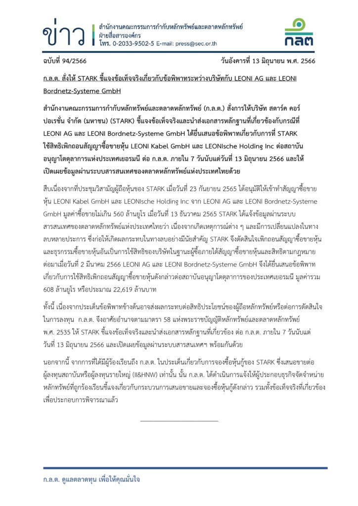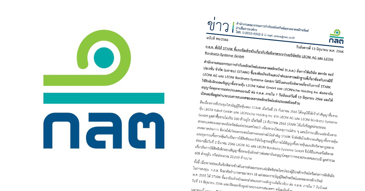 สำนักงานคณะกรรมการกำกับหลักทรัพย์และตลาดหลักทรัพย์ (ก.ล.ต.) สั่งการให้บริษัท สตาร์ค คอร์ปอเรชั่น จำกัด (มหาชน) (STARK) ชี้แจงข้อเท็จจริงและนำส่งเอกสารหลักฐานที่เกี่ยวข้องกับกรณีที่ LEONI AG และ LEONI Bordnetz-Systeme GmbH ได้ยื่นเสนอข้อพิพาทเกี่ยวกับการที่ STARK ใช้สิทธิเพิกถอนสัญญาซื้อขายหุ้น LEONI Kabel GmbH และ LEONIsche Holding Inc ต่อสถาบันอนุญาโตตุลาการแห่งประเทศเยอรมนี ต่อ ก.ล.ต. ภายใน 7 วัน นับแต่วันที่ 13 มิ.ย. 2566 และให้เปิดเผยข้อมูลผ่านระบบสารสนเทศของตลาดหลักทรัพย์แห่งประเทศไทย (ตลท.) ด้วย