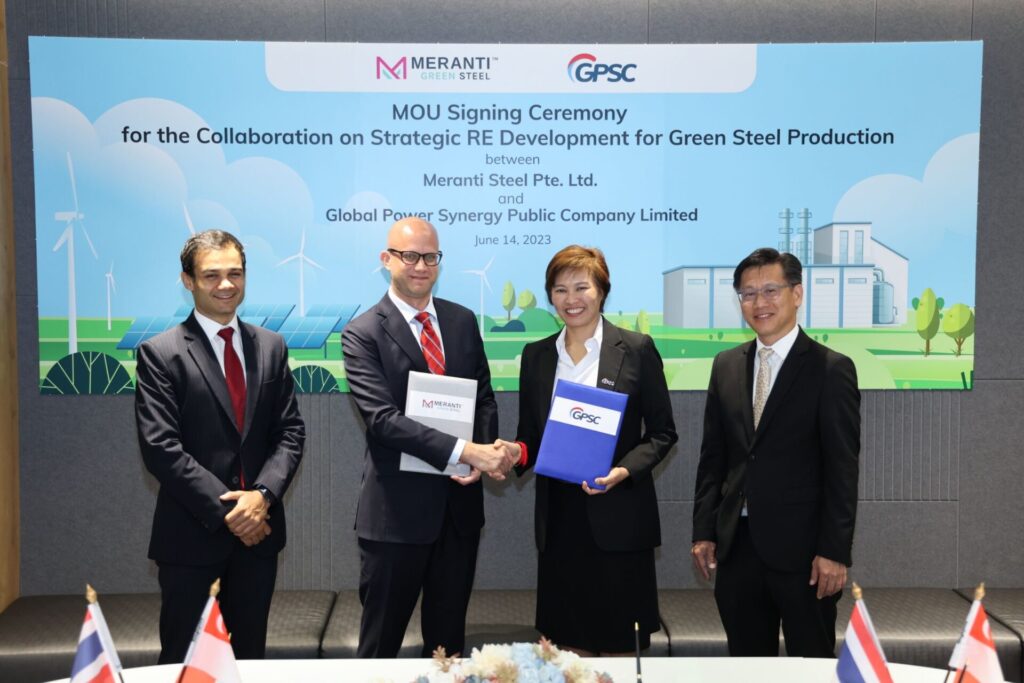 นางรสยา เธียรวรรณ รองกรรมการผู้จัดการใหญ่พัฒนาธุรกิจ บริษัท โกลบอล เพาเวอร์ ซินเนอร์ยี่ จำกัด (มหาชน) หรือ GPSC แกนนำนวัตกรรมธุรกิจไฟฟ้ากลุ่ม ปตท. เปิดเผยว่า วันนี้ (14 มิถุนายน 2566) GPSC ได้ร่วมลงนามในบันทึกข้อตกลงความร่วมมือ (MOU) กับ บริษัท มีเรนติ สตีล จำกัด (Meranti Steel Pte.Ltd.)ผู้ผลิตเหล็กชั้นนำของประเทศสิงคโปร์ เพื่อศึกษาความเป็นไปได้ในการพัฒนาโครงการพลังงานสะอาด และระบบบริหารจัดการด้านพลังงานเพื่อใช้ในกระบวนการผลิตเหล็กที่เป็นมิตรกับสิ่งแวดล้อม โดย Meranti มีแผนที่จะเข้ามาตั้งโรงงานผลิตเหล็กคุณภาพสูงในไทย เน้นใช้พลังงานสะอาด ทั้งในกลุ่มพลังงานแสงอาทิตย์ และพลังงานลม