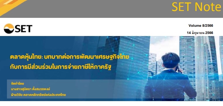 ตลาดหลักทรัพย์ฯ เผยแพร่บทความ “SET Note” ตลาดหุ้นไทย: บทบาทต่อการพัฒนาเศรษฐกิจไทยกับการมีส่วนร่วมในการจ่ายภาษีให้ภาครัฐ โดยระบุว่า ตลาดทุนประกอบด้วยผู้มีส่วนร่วมเกี่ยวข้องหลายฝ่าย ซึ่งมีส่วนในการสร้างงาน สร้างนวัตกรรม สร้างกำลังซื้อผ่านการจ้างงาน และสร้างผลกำไร ถือว่าเป็นเครื่องมือสำคัญในการสร้างรายได้ ให้ภาครัฐผ่านการมีส่วนร่วมในการจ่ายภาษี และเป็น “ห่านทองคำ” อีกตัวหนึ่งในการเสริมสร้างการเติบโตของเศรษฐกิจประเทศไทย