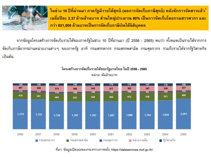 ในช่วง 10 ปีที่ผ่านมา (ปี 2556 – 2565) รัฐบาลไทยจัดเก็บภาษีสุทธิหลังหักการจัดสรรแล้วเฉลี่ยปีละ 2.37 ล้านล้านบาท ส่วนใหญ่ประมาณ 80% จัดเก็บโดยกรมสรรพากร และกว่า 631,000 ล้านบาทเป็นการจัดเก็บภาษีเงินได้นิติบุคคล