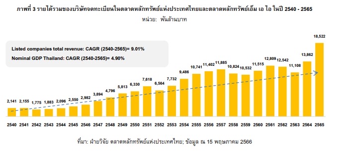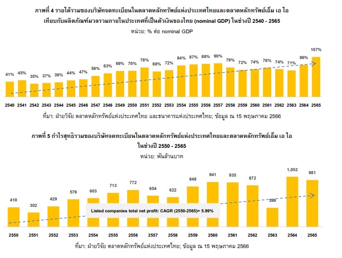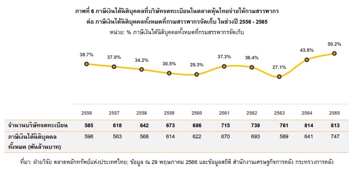 หากพิจารณาเฉพาะภาษีเงินได้นิติบุคคลของบริษัทจดทะเบียนในตลาดหุ้นไทยจากงบการเงินรวม พบว่า ในปี 2565 บริษัทจดทะเบียนไทย 813 บริษัท จ่ายภาษีเงินได้นิติบุคคลรวมสูงสุดในประวัติศาสตร์ด้วยมูลค่ารวมกว่า 375,000 ล้านบาท คิดเป็น 50.2% ของภาษีนิติบุคคลที่กรมสรรพากรจัดเก็บทั้งหมดในปี 2565