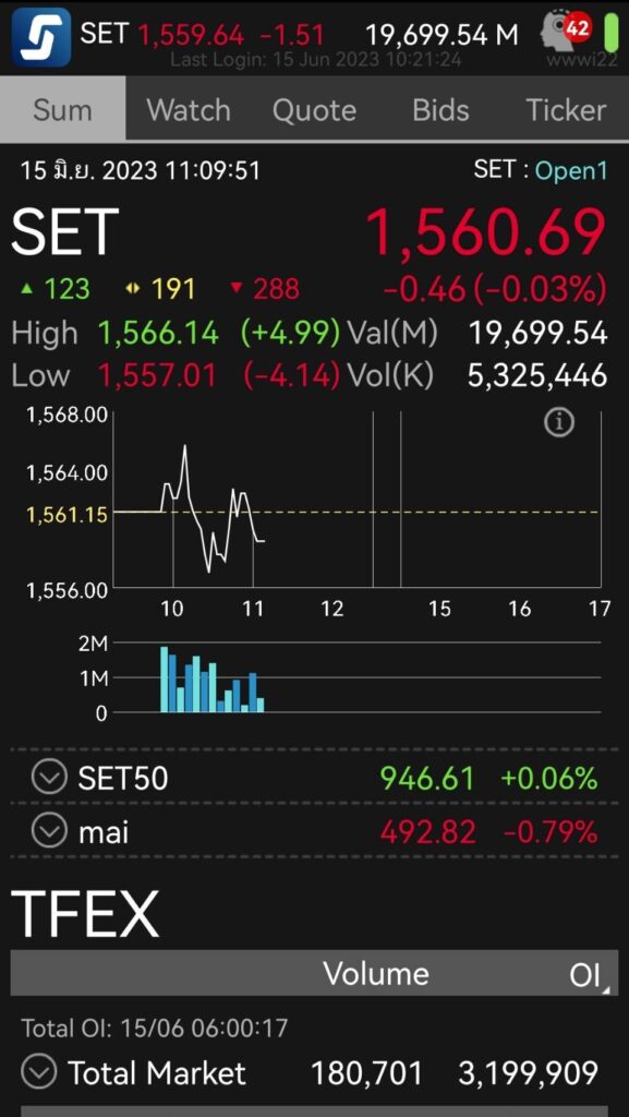 ตลาดหุ้นไทยเมื่อเวลา 11.09 น. ดัชนี SET อยู่ที่1,560.69 จุด ปรับตัวลง 0.46 จุด หลังจากเปิดเช้านี้ ดัชนี SET 1,559.35 จุด ปรับตัวลง 1.80 จุด