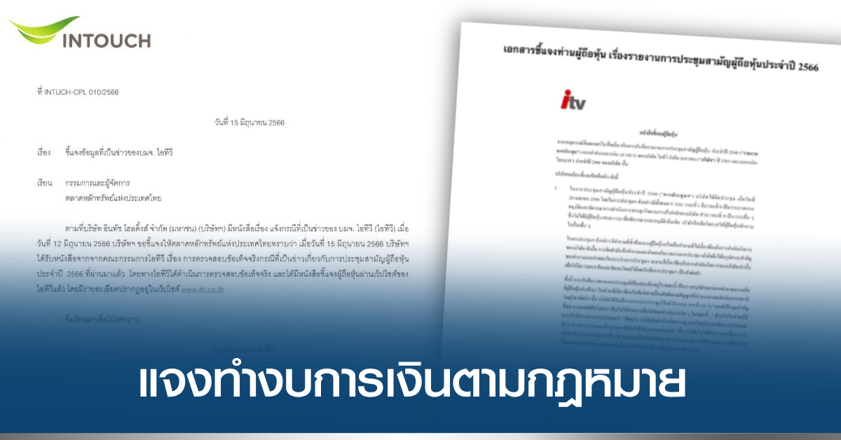วันนี้ (15 มิ.ย.66) บริษัท อินทัช โฮลดิ้งส์ จำกัด (มหาชน) หรือ INTUCH ทำหนังสือถึงตลาดหลักทรัพย์แห่งประเทศไทย (ตลท.) ชี้แจงข้อมูลที่เป็นข่าว กรณีบริษัท ไอทีวี จำกัด (มหาชน) โดยระบุว่า ตามที่บริษัทฯ มีหนังสือเรื่อง แจ้งกรณีที่เป็นข่าวของ บมจ.ไอทีวี เมื่อวันที่ 12 มิ.ย.66 นั้น ขอชี้แจงให้ตลาดหลักทรัพย์ฯ ทราบว่า วันนี้ บริษัทฯ ได้รับหนังสือจากคณะกรรมการไอทีวี เรื่อง การตรวจสอบข้อเท็จจริงกรณีที่เป็นข่าวเกี่ยวกับการประชุมสามัญผู้ถือหุ้น ประจำปี 2566 ที่ผ่านมาแล้ว โดยทางไอทีวีได้ดำเนินการตรวจสอบข้อเท็จจริง และได้มีหนังสือชี้แจงผู้ถือหุ้นผ่านเว็บไซต์ของไอทีวีแล้ว โดยมีรายละเอียดปรากฏอยู่ในเว็บไซต์ www.itvco.th