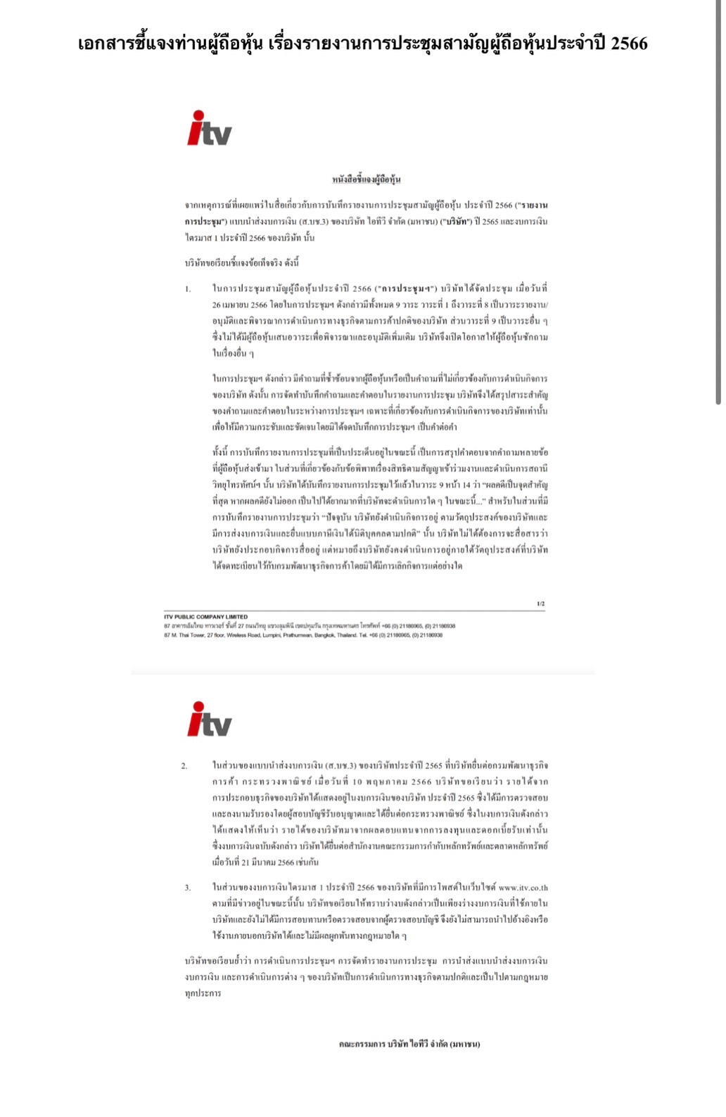 ผู้สื่อข่าวตรวจสอบไปที่เว็บไซต์ www.itvco.th พบว่ามีการเผยแพร่เอกสารชี้แจงผู้ถือหุ้น เรื่องรายงานการประชุมสามัญผู้ถือหุ้นประจำปี 2566 โดยมีสาระสำคัญว่า คณะกรรมการไอทีวี ได้จัดทำรายงานการประชุม การนำส่งแบบ นำส่งงบการเงิน และการดำเนินการต่างๆ ของบริษัทฯ เป็นการดำเนินการทางธุรกิจตามปกติ และเป็นไปตามกฎหมายทุกประการ โดยขอชี้แจง 3 ประเด็น ได้แก่