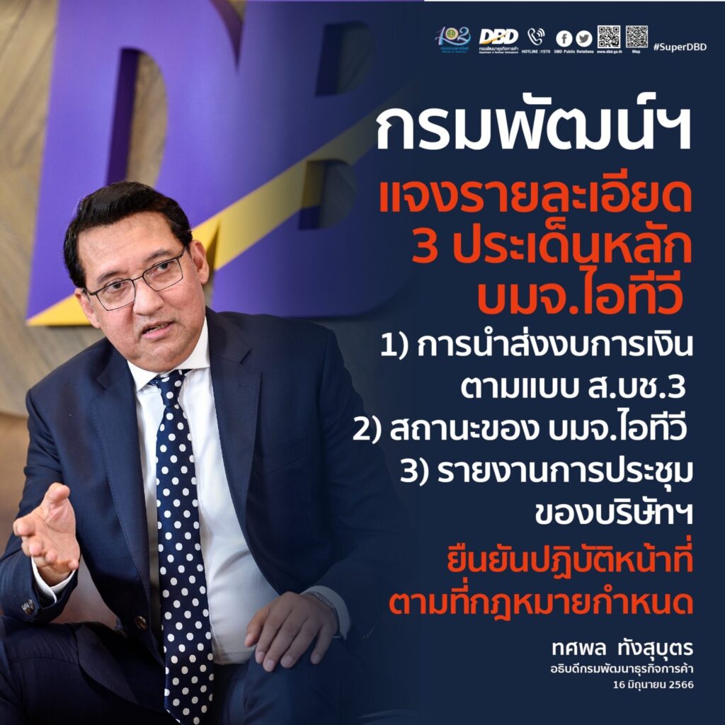 นายทศพล ทังสุบุตร อธิบดีกรมพัฒนาธุรกิจการค้า กระทรวงพาณิชย์ เปิดเผยว่า “ตามที่ได้ปรากฏข่าวเกี่ยวกับบริษัทไอทีวี จำกัด (มหาชน) ทำให้เกิดข้อสงสัยจากสาธารณชนหลากหลายประเด็น โดยเฉพาะประเด็นการนำส่งงบการเงินตามแบบ ส.บช.3 และรายละเอียดด้านอื่นๆ กรมพัฒนาธุรกิจการค้า ได้รวบรวมประเด็นที่เป็นข้อสงสัยหลักของสาธารณชน 3 ประเด็น ประกอบด้วย 1) การนำส่งงบการเงินตามแบบ ส.บช.3 2) สถานะของ บมจ.ไอทีวี และ 3) รายงานการประชุมของบริษัทฯ กรมฯ ขอชี้แจงตามประเด็นดังกล่าว ดังนี้