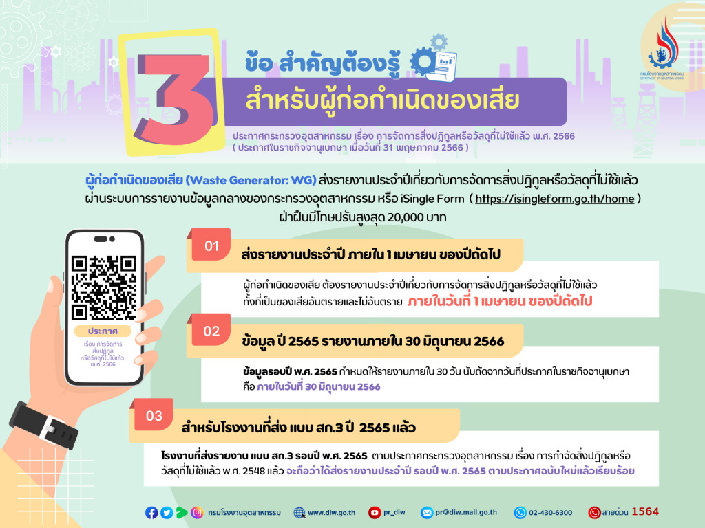 ทั้งนี้ ได้กำหนดให้โรงงานผู้ก่อกำเนิดของเสียทุกโรงงานต้องรายงานข้อมูลผ่านระบบการรายงานข้อมูลกลางของกระทรวงอุตสาหกรรม หรือ iSingle Form (https://isingleform.go.th/home) ภายใน 30 มิถุนายน 2566 หากฝ่าฝืนไม่รายงานหรือรายงานล่าช้ามีโทษปรับสุงสุด 20,000 บาท