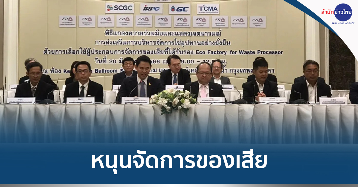 ทั้งนี้ได้มีการประกาศเจตนารมณ์ร่วมกันระหว่าง 4 ฝ่าย ได้แก่ ส.อ.ท. กนอ. กลุ่มอุตสาหกรรมการจัดการเพื่อสิ่งแวดล้อม และ ผู้ประกอบการจัดการของเสียอุตสาหกรรม เพื่อสนับสนุนและส่งเสริมให้ผู้ประกอบการจัดการของเสีย (Waste Processor) ได้รับรองมาตรฐานโรงงานอุตสาหกรรมเชิงนิเวศสำหรับผู้ประกอบการจัดการของเสีย (Eco Factory for Waste Processor) ครบ 100% ภายในปี 2568 ซึ่งปัจจุบัน กนอ.และ ส.อ.ท. ได้ให้การรับรองโรงงานอุตสาหกรรมภายใต้มาตรฐาน Eco Factory จำนวน 379 แห่ง และมาตรฐาน Eco Factory for Waste Processor จำนวน 9 แห่ง และอยู่ระหว่างการเตรียมความพร้อมจำนวน 18 แห่ง