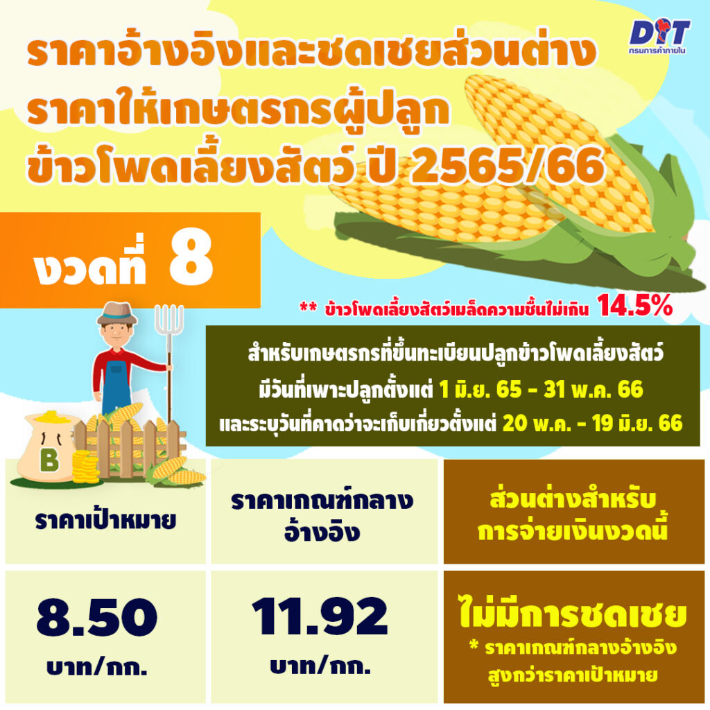 นายอุดม ศรีสมทรง รองอธิบดีกรมการค้าภายใน เปิดเผยว่า คณะอนุกรรมการกำกับดูแลและกำหนดเกณฑ์กลางอ้างอิงโครงการประกันรายได้เกษตรกรผู้ปลูกข้าวโพดเลี้ยงสัตว์ ได้พิจารณาราคาเกณฑ์กลางอ้างอิงและการชดเชยส่วนต่างราคาตามโครงการประกันรายได้เกษตรกรผู้ปลูกข้าวโพดเลี้ยงสัตว์ ปี 2565/66 (งวดที่ 8) ซึ่งเป็นการดำเนินการตามนโยบายของรองนายกรัฐมนตรีและรัฐมนตรีว่าการกระทรวงพาณิชย์ (นายจุรินทร์ ลักษณวิศิษฏ์) โดยเมื่อวันที่ 16 มิถุนายน 2566 เป็นการประกาศราคาเกณฑ์กลางอ้างอิงงวดที่ 8 สำหรับเกษตรกรที่แจ้งวันคาดว่าจะเก็บเกี่ยวตั้งแต่วันที่ 20 พฤษภาคม ถึงวันที่ 19 มิถุนายน 2566 ปรากฏว่ามีราคาเกณฑ์กลางอ้างอิงของงวดที่ 8 กก.ละ 11.92 บาท ซึ่งมีราคาสูงกว่าราคาประกันที่ กก.ละ 8.50 บาท จึงไม่มีส่วนต่างชดเชยให้แก่เกษตรกร ทั้งนี้ ราคาเกณฑ์กลางอ้างอิงฯ งวดนี้ ต่ำกว่าราคาเกณฑ์กลางอ้างอิงในงวดที่ 7 ของโครงการฯ ปี 2565/66 (กก.ละ 11.95 บาท) ที่ผ่านมา และต่ำกว่าราคาเกณฑ์กลางอ้างอิงในงวดที่ 8 ของโครงการฯ ปี 2564/65 (กก.ละ 12.41 บาท)
