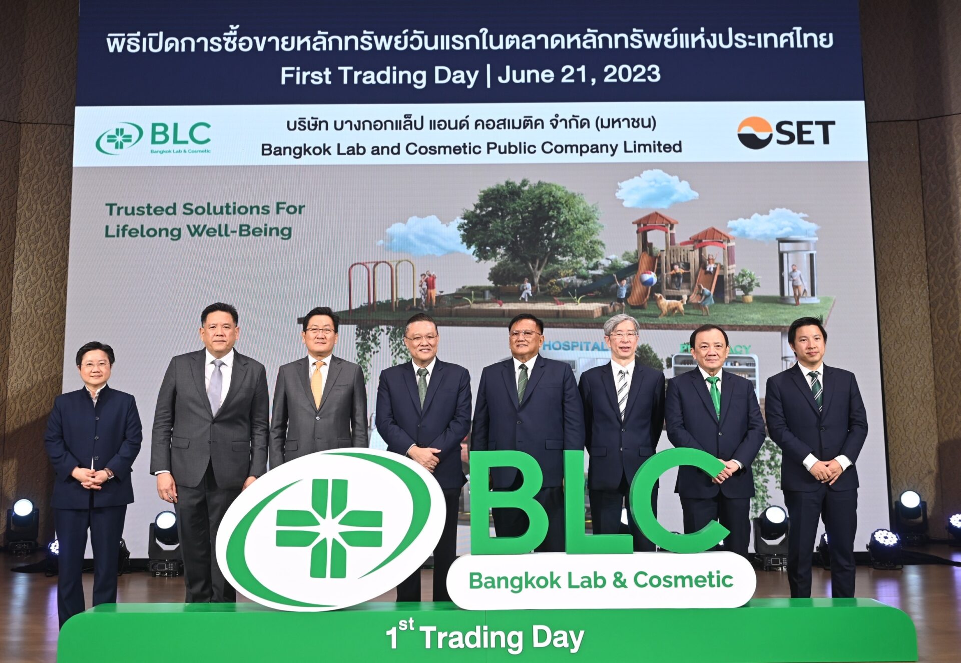 นายภากร ปีตธวัชชัย กรรมการและผู้จัดการ ตลาดหลักทรัพย์แห่งประเทศไทย (ตลท.) นายแมนพงศ์ เสนาณรงค์ รองผู้จัดการ หัวหน้าสายงานผู้ออกหลักทรัพย์ ตลท. พร้อมด้วย ภก.สุวิทย์ งามภูพันธ์ ประธานเจ้าหน้าที่บริหาร บมจ. บางกอกแล็ป แอนด์ คอสเมติค ร่วมพิธีเปิดการซื้อขายวันแรกในตลาดหลักทรัพย์แห่งประเทศไทย (SET) ของ บมจ. บางกอกแล็ป แอนด์ คอสเมติค ในกลุ่มอุตสาหกรรมสินค้าอุปโภคและบริโภค หมวดของใช้ส่วนตัวและเวชภัณฑ์ โดยใช้ชื่อย่อในการซื้อขายหลักทรัพย์ว่า “BLC” เปิดเทรดวันแรก ที่ราคา 10.50 บาท เท่ากับราคา IPO โดยปิดการซื้อขายครึ่งวันเช้าที่ ราคา 7.60 บาท ลดลง 2.90 บาท หรือลดลง 27.61%