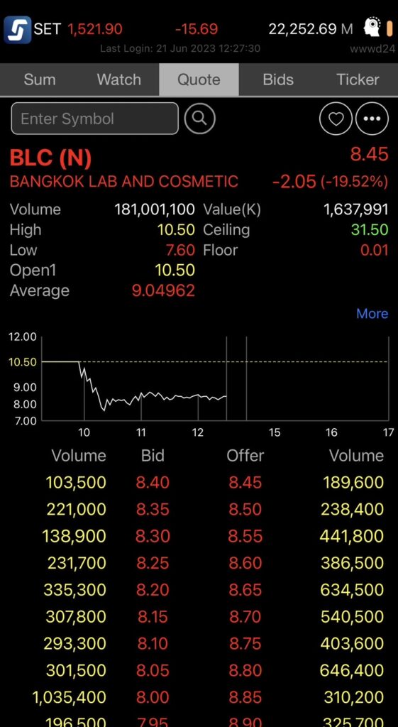 กรุงเทพฯ 21 มิ.ย. – ราคาหุ้น BLC เปิดเทรดวันแรกใน SET ที่ 10.50 บาท เท่าราคา IPO ก่อนปิดตลาดภาคเช้าที่ราคา 7.60 บาท ลดลง 2.90 บาท ร่วงลงหนัก 27.61%