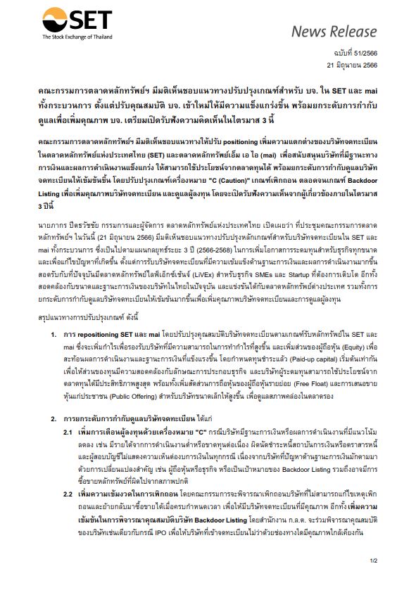 กรุงเทพฯ 21 มิ.ย. – บอร์ดตลาดหลักทรัพย์ฯ เห็นชอบแนวทางให้ปรับ positioning เพิ่มความแตกต่างของบริษัทจดทะเบียนในตลาดหลักทรัพย์แห่งประเทศไทย (SET) และตลาดหลักทรัพย์ เอ็ม เอ ไอ (mai) เพื่อสนับสนุนบริษัทที่มีฐานะทางการเงินและผลการดำเนินงานแข็งแกร่ง ให้สามารถใช้ประโยชน์จากตลาดทุนได้ ยกระดับการกำกับดูแล บจ.เข้มข้นขึ้น ปรับปรุงเกณฑ์เครื่องหมาย “C (Caution)” เกณฑ์เพิกถอน เกณฑ์ Backdoor Listing เพื่อเพิ่มคุณภาพ บจ. และดูแลผู้ลงทุน เปิดรับฟังความเห็นในไตรมาส 3 ปีนี้