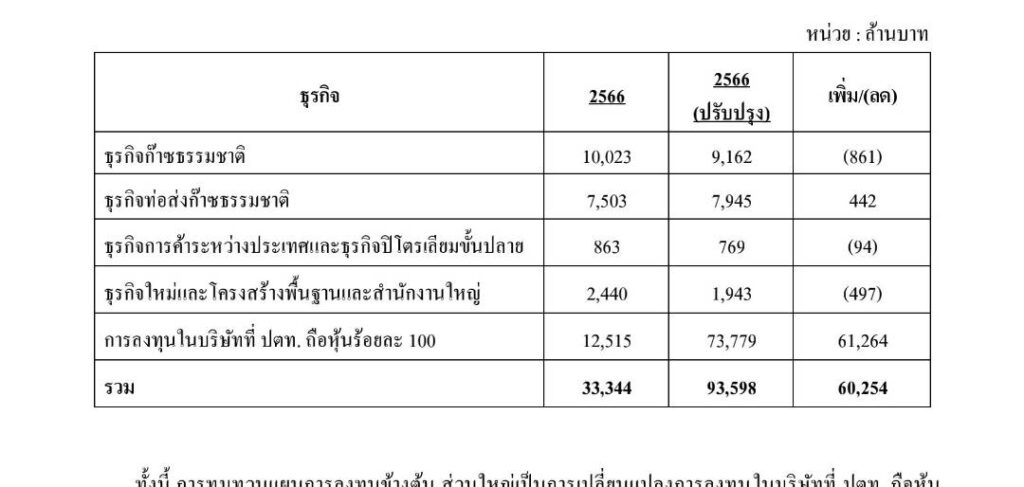 นายอรรถพล ฤกษ์พิบูลย์ ประธานเจ้าหน้าที่บริหารและกรรมการผู้จัดการใหญ บริษัท ปตท. จำกัด (มหาชน) หรือ PTT แจ้งตลาดหลักทรัพย์ว่าคณะกรรมการ ปตท. มีการประชุมคร้ังที่ 6/2566 เมื่อวันที่ 21 มิถุนายน 2566 ได้ทบทวนแผนการลงทุนของ ปตท. และบริษัทที่ ปตท. ถือหุ้น 100% และอนุมัติให้ปรับแผนการลงทุนสำหรับปี 2566 จาก 33,344 ล้านบาท เป็น 93,598 ล้านบาท โดยมีรายละเอียดดังนี้