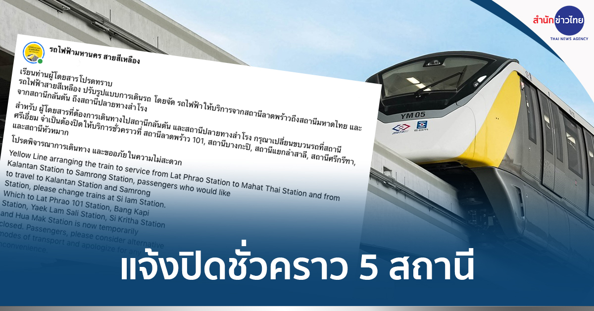 กทม. 22 มิ.ย.- รถไฟฟ้าสายสีเหลือง ปรับรูปแบบการเดินรถ แจ้งปิดให้บริการชั่วคราว 5 สถานี ลาดพร้าว 101 บางกะปิ แยกลำสาลี ศรีกรีฑา และหัวหมาก