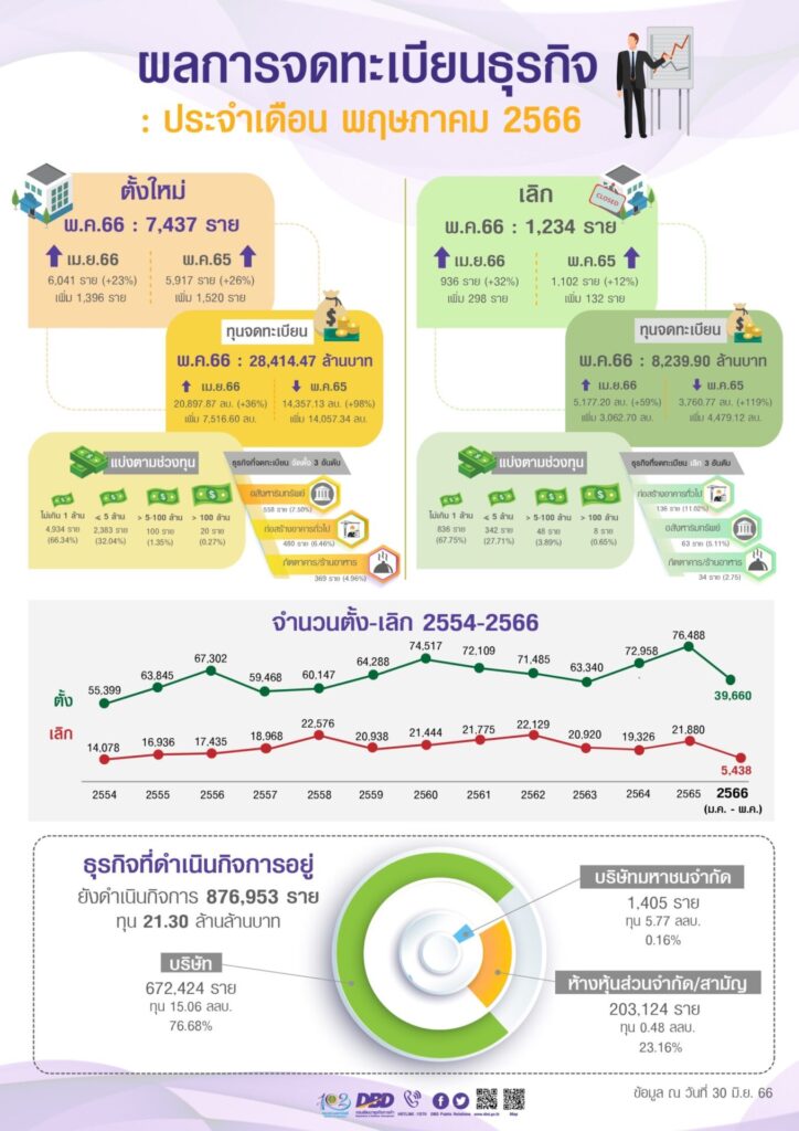 นายจุรินทร์ ลักษณวิศิษฏ์ รองนายกรัฐมนตรีและรัฐมนตรีว่าการกระทรวงพาณิชย์กล่าวถึงยอดจดทะเบียนนิติบุคคลทั่วประเทศประจําเดือนพฤษภาคม 2566 มีการจดทะเบียนจัดตั้งธุรกิจใหม่จำนวน 7,437 ราย เพิ่มขึ้น เมื่อเทียบกับช่วงเวลาเดียวกันของปีที่ผ่านมาคิดเป็น 25.69% (พฤษภาคม 2565) และเพิ่มขึ้นจากเดือนที่ผ่านมาคิดเป็น 23.11% (เมษายน 2566) โดยประเภทธุรกิจจัดตั้งใหม่สูงสุด 3 อันดับแรก ได้แก่ ธุรกิจอสังหาริมทรัพย์ จํานวน 558 ราย คิดเป็น 7.50% รองลงมา คือ ธุรกิจก่อสร้างอาคารทั่วไป จํานวน 480 ราย คิดเป็น 6.46% และอันดับ 3 คือ ธุรกิจภัตตาคาร/ร้านอาหาร จํานวน 369 ราย คิดเป็น 4.96% ตามลําดับ