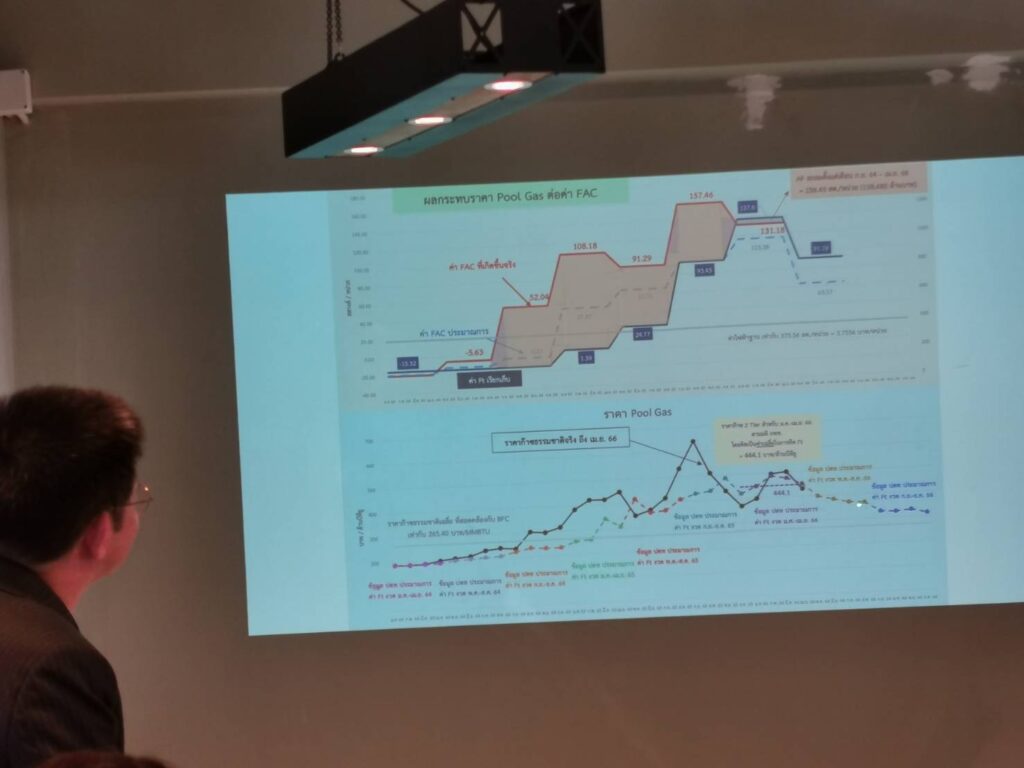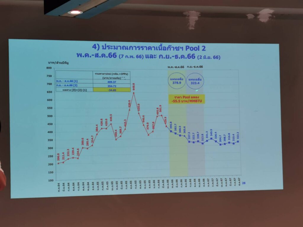 ข้อมูลประมาณการคำนวณค่าไฟฟ้าผันแปร (เอฟที) งวดเดือน ก.ย.-ธ.ค.66 ที่ได้รับจากบริษัท ปตท. จำกัด (มหาชน) ราคาแอลเอ็นจีตลาดจร (LNG Spot) เฉลี่ยอยู่ที่ 13.295 ดอลลาร์ฯ/ล้านบีทียู และราคา POOL GAS ที่เป็นราคาคำนวณรวมระหว่างก๊าซอ่าวไทย เมียนมา และแอลเอ็นจี จะอยู่ที่ราว 343 บาท/ล้านบีทียู ในขณะที่ปริมาณก๊าซในอ่าวไทย โดยเฉพาะแหล่งเอราวัณ (จี1/61) ปริมาณเพิ่มขึ้น โดยคาดเดือน ก.ค.66 จะมีกำลังผลิตที่ 400 ล้านลูกบาศก์ฟุต/วัน จากปัจจุบันที่ระดับ 200 ล้านลูกบาศก์ฟุต/วัน และช่วงสิ้นปีนี้จะอยู่ที่ 588 ล้านลูกบาศก์ฟุต/วัน นอกจากนี้ ปริมาณการใช้ไฟฟ้าของประเทศมีหน่วยเพิ่มขึ้นตามธุรกิจการท่องเที่ยว และต้องพิจารณาถึงเงินบาท โดยการอ่อนค่าลงอยู่ที่ประมาณ 34.79 บาท/ดอลลาร์ฯ ก็มีผลทำให้ต้นทุนค่าไฟฟ้าพุ่งขึ้น
