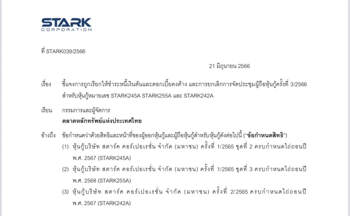บมจ.สตาร์ค คอร์เปอเรชั่น (STARK) ทำหนังสือถึงตลาดหลักทรัพย์แห่งประเทศไทย (ตลท.) ชี้แจงการถูกเรียกให้ชำระหนี้เงินต้นและดอกเบี้ยคงค้างของหุ้นกู้หมายเลข STARK245A, STARK255A และ STARK242A และการยกเลิกการจัดประชุมผู้ถือหุ้นกู้ครั้งที่ 3/2566 ในวันที่ 23 มิ.ย.2566 ว่า บริษัทมิได้นิ่งนอนใจ และกำลังพิจารณาทำการสื่อสาร เจรจา หาทางออกร่วมกับเจ้าหนี้ดังกล่าวอยู่ เพื่อให้เจ้าหนี้ระงับซึ่งการใช้สิทธิดังกล่าว แต่ยังไม่สามารถสรุปยอดหนี้ที่อาจมีการใช้สิทธิในแบบเดียวกันได้ เนื่องจากเหตุแห่งการเรียกชำระหนี้โดยพลันของหุ้นกู้หมายเลข STARK245A STARK255A และ STARK242A เพิ่งจะเกิดขึ้น
