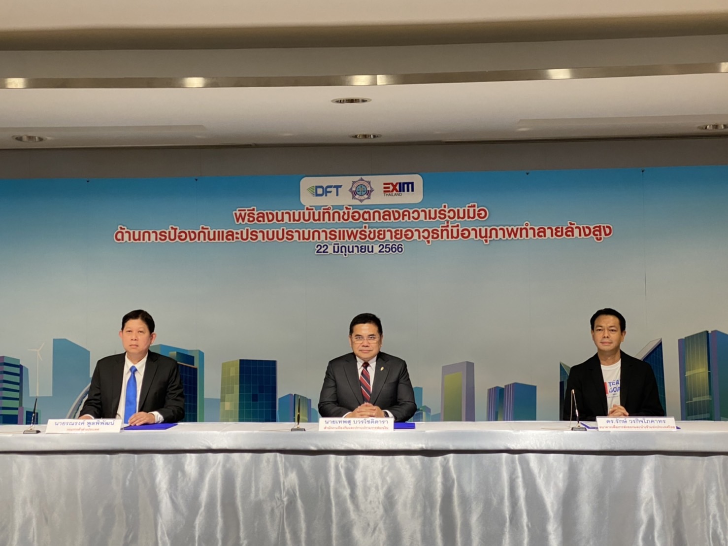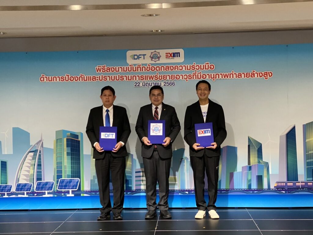 นายรักษ์ วรกิจโภคาทร กรรมการผู้จัดการ ธนาคารเพื่อการส่งออกและนำเข้าแห่งประเทศไทย (EXIM BANK) นายรณรงค์ พูลพิพัฒน์ อธิบดีกรมการค้าต่างประเทศ (คต.) กระทรวงพาณิชย์ และกรรมการ EXIM BANK และนายเทพสุ บวรโชติดารา เลขาธิการคณะกรรมการป้องกันและปราบปรามการฟอกเงิน (ปปง.) ร่วมลงนามในบันทึกข้อตกลง (MOU) ว่าด้วยความร่วมมือด้านการป้องกันและปราบปรามการแพร่ขยายอาวุธมีอานุภาพทำลายล้างสูง (Weapons of Mass Destruction : WMD) เพื่อเสริมสร้างความเชื่อมั่นให้กับนานาชาติต่อการปฏิบัติตามมาตรฐานสากล