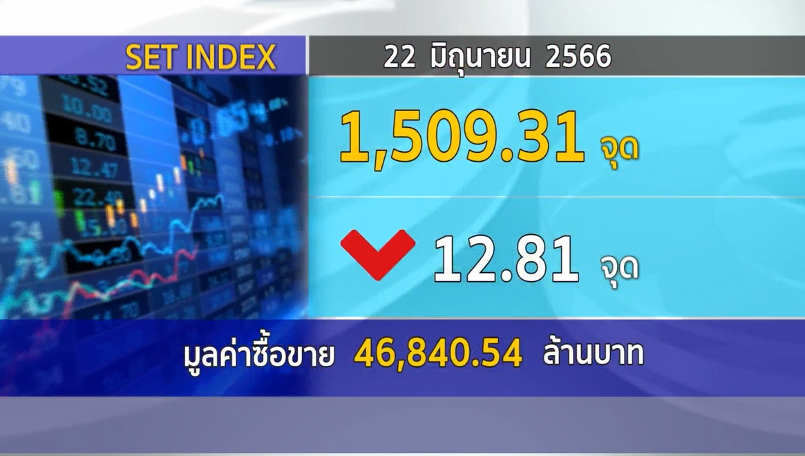 กทม. 22มิ.ย.-SET ปิดวันนี้ที่ 1,509.31 จุด ลดลง 12.81 จุด (-0.84%) มูลค่าซื้อขาย 46,825.48 ล้านบาท