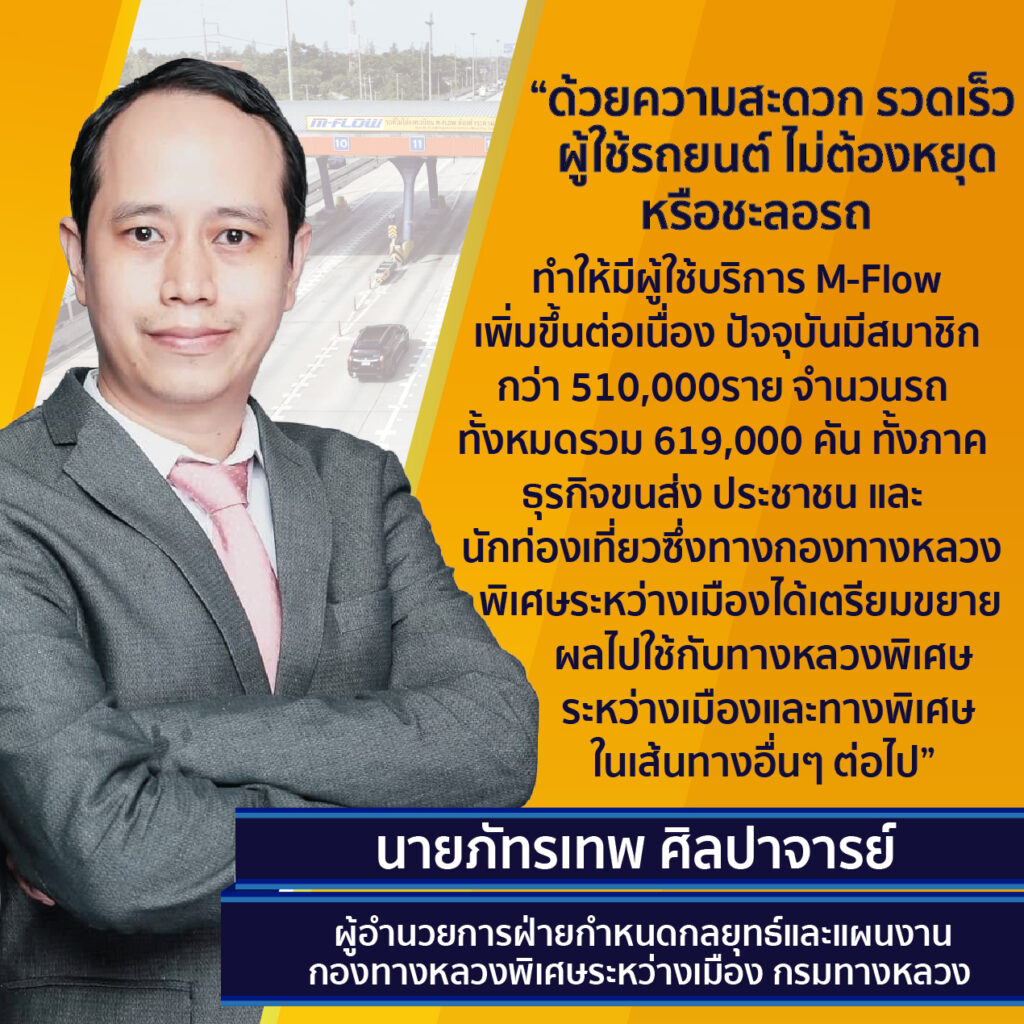 “ผู้ใช้รถยนต์ที่ขับขี่ผ่าน M-Flow ไม่ต้องหยุด หรือชะลอรถ สามารถใช้ความเร็วได้ถึง 120 กม./ชม. ปัจจุบันมีสมาชิกกว่า 510,000 ราย จำนวนรถทั้งหมดรวม 619,000 คัน”