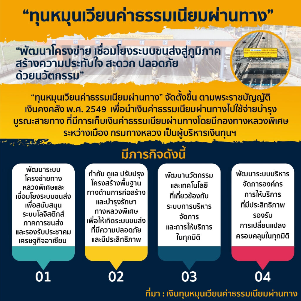 24 มิ.ย. – หนึ่งใน “ทุนหมุนเวียน” ภายใต้การกำกับดูแลของระบบการบริหารทุนหมุนเวียนกลุ่มประเภทเพื่อการบริการ มีภารกิจ “พัฒนาโครงข่าย เชื่อมโยงระบบขนส่งสู่ภูมิภาค สร้างความประทับใจ สะดวก ปลอดภัย ด้วยนวัตกรรม” คือ “เงินทุนค่าธรรมเนียมผ่านทาง”