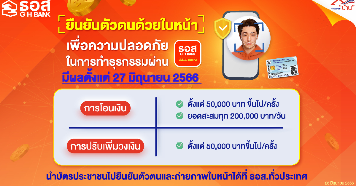 ธนาคารอาคารสงเคราะห์ (ธอส.) พร้อมสนับสนุนนโยบายของธนาคารแห่งประเทศไทย (ธปท.) ในการพัฒนาเทคโนโลยีเพื่อยกระดับความปลอดภัยให้กับลูกค้าในการทำธุรกรรมผ่าน Application : GHB ALL GEN ด้วยการเปิดระบบการสแกนใบหน้าเพื่อยืนยันตัวตนเมื่อทำธุรกรรมการโอนเงิน ได้ตั้งแต่วันที่ 27 มิถุนายน 2566 เป็นต้นไป มุ่งเน้นกลุ่มลูกค้าต้องการโอนเงินตั้งแต่ 50,000 บาทขึ้นไปต่อรายการ ยอดทำธุรกรรมสะสม 200,000 บาทต่อวัน และลูกค้าที่ต้องการขอปรับเพิ่มวงเงินการทำรายการโอนตั้งแต่ 50,000 บาทต่อวันขึ้นไป