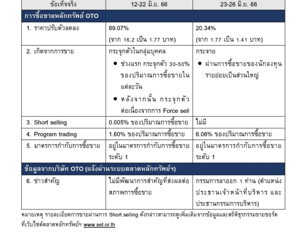 ตามที่ตลาดหลักทรัพย์ฯ ได้แจ้งข้อเท็จจริงเมื่อวันที่ 22 มิ.ย. 66 เกี่ยวกับสภาพการซื้อขายในหลักทรัพย์ บริษัท วันทูวัน คอนแทคส์ จำกัด (มหาชน) (OTO) ที่สภาพการซื้อขายเปลี่ยนแปลงไปอย่างมากในระหว่างวันที่ 12-22 มิ.ย. 66 ว่าราคาปรับลดลงมากเกิดจากการขายกระจุกตัวในกลุ่มบุคคล ทำให้เกิดการบังคับขาย (Force sell) ในเวลาต่อมา โดยสัดส่วน Short selling และ Program trading น้อยมากนั้น