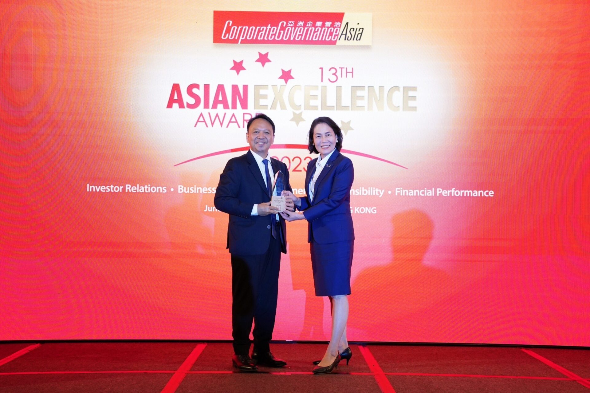 รางวัล 13th Asian Excellence Award จัดโดยนิตยสาร Corporate Governance Asia ณ โรงแรม JW Marriot เขตปกครองพิเศษฮ่องกงแห่งสาธารณรัฐประชาชนจีน โดยพิจารณารางวัลจากข้อมูลองค์กรร่วมกับผลสำรวจความคิดเห็นของนักลงทุน นักวิเคราะห์ และผู้ทรงคุณวุฒิ ทั่วภูมิภาคเอเชีย เพื่อมอบรางวัลให้กับบุคคลหรือองค์กรที่มีการดำเนินธุรกิจอย่างยั่งยืนและมีธรรมาภิบาล พร้อมดูแลรับผิดชอบชุมชน สังคม และสิ่งแวดล้อมในระดับดีเยี่ยม.-สำนักข่าวไทย