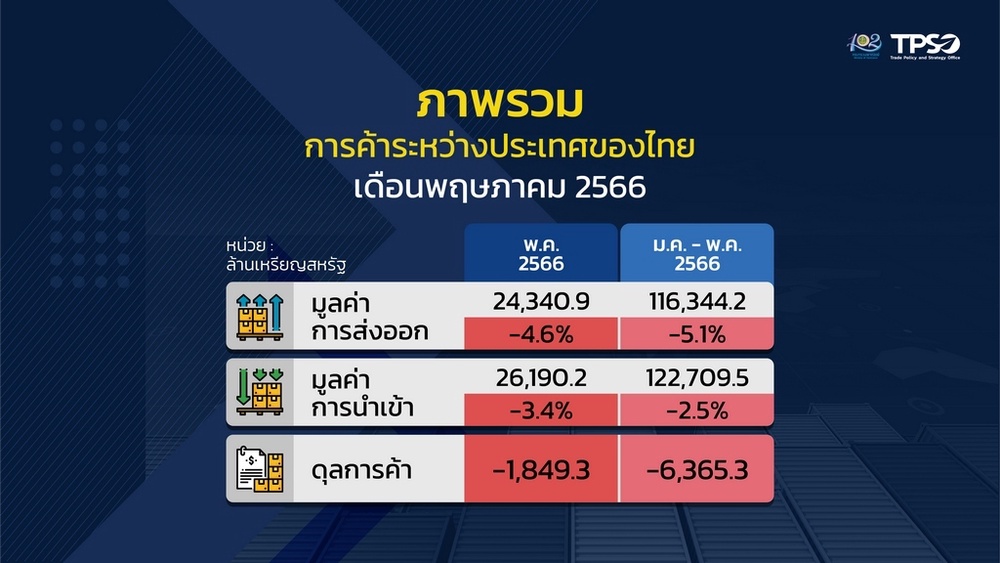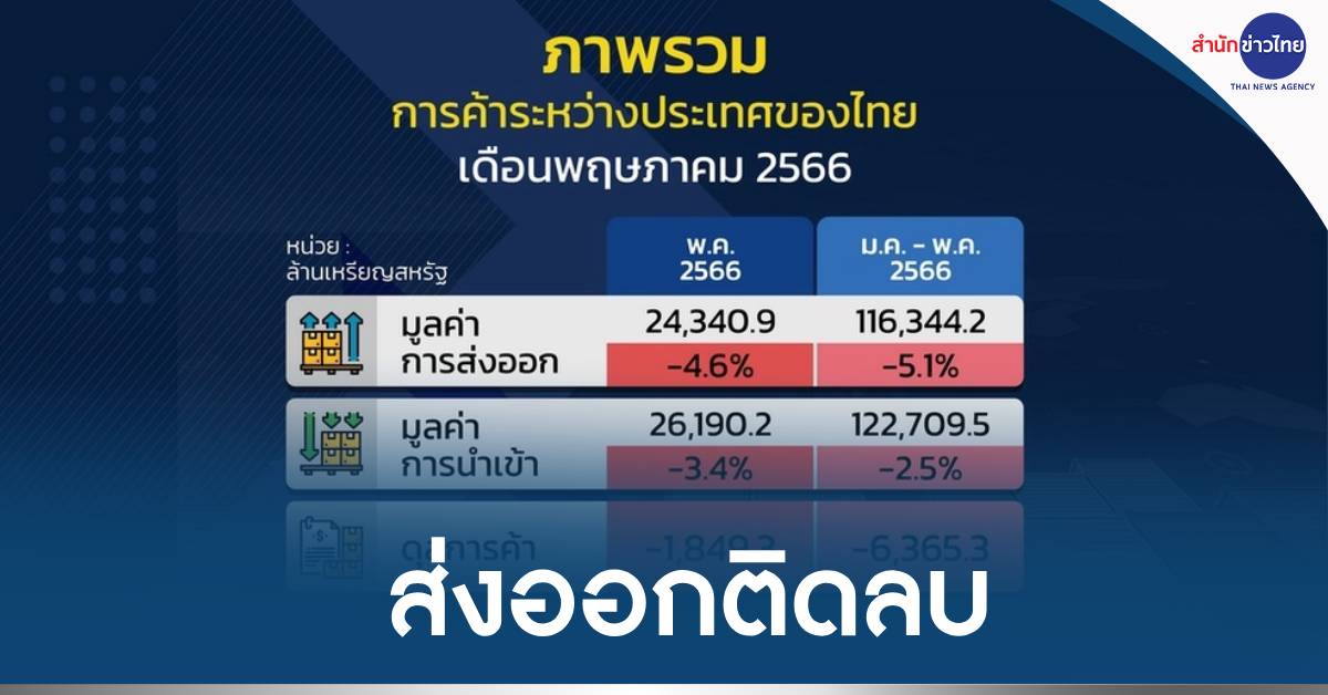 นายกีรติ รัชโน ปลัดกระทรวงพาณิชย์ เปิดเผย ว่าการส่งออกไทยในเดือนพฤษภาคม 2566 ว่า ติดลบ 4.6% หรือมีมูลค่า 24,340.9 ล้านดอลลาร์สหรัฐฯ การนำเข้า ติดลบ 3.4% หรือมูลค่า 26,190 ล้านดอลลาร์สหรัฐ ดุลการค้ายังติดลบ1,849ล้านดอลลาร์สหรัฐ ส่งผลให้ส่งออกไทย5เดือน (มกราคม-พฤษภาคม)ติดลบ 5.1% หรือมีมูลค่า 116,344.2ล้านดอลลาร์สหรัฐ มูลค่าการนำเข้า ติดลบ 2.5% มูลค่า 122,709 ล้านดอลลาร์สหรัฐ ส่งผลไทยขาดดุลการค้า 5 เดือนแรกที่ 6,365 ล้านดอลลาร์สหรัฐ