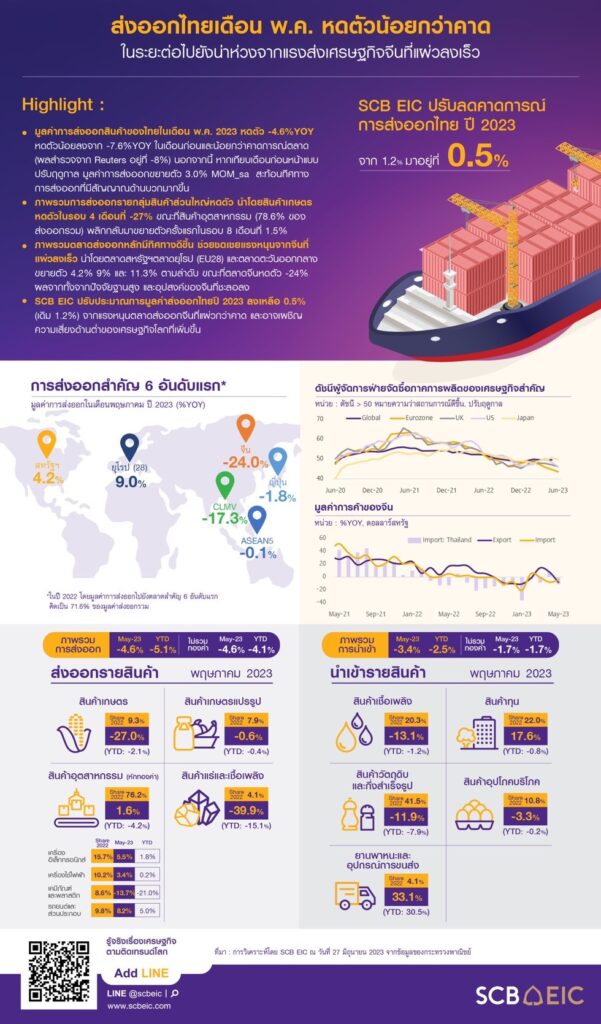 SCB EIC มองการส่งออกไทยในช่วงที่เหลือของปีมีแนวโน้มเผชิญแรงกดดันมากกว่าที่เคยประเมินไว้ จากแรงหนุนสำคัญจากจีนที่ยังไม่ฟื้นตัวชัดเจน การนำเข้าสินค้าไทยของจีนในเดือน พ.ค. กลับมาหดตัวแรงอีกครั้ง ร้อยละ-11.2 หลังขยายตัวได้ครั้งแรกในรอบ 10 เดือนที่ร้อยละ 8.2 ในเดือน เม.ย. สอดคล้องกับภาพรวมการนำเข้าของจีนส่วนใหญ่ยังหดตัวต่อเนื่องมา และภาพรวมการส่งออกของจีนหดตัวแรง ร้อยละ -8 เป็นครั้งแรกในรอบ 3 เดือนตามอุปสงค์โลกที่ยังอ่อนแอ รวมถึง ดัชนี Flash Manufacturing PMI ในเดือน มิ.ย. ของประเทศคู่ค้าสำคัญยังอยู่ในภาวะหดตัวจากอุปสงค์สินค้าที่อ่อนแอ นำโดย US Manufacturing PMI ลดลงมาอยู่ในระดับ 46.3 (48.4 ในเดือน พ.ค.) Eurozone Manufacturing PMI ลดลงมาอยู่ที่ 43.6 ต่ำสุดในรอบ 37 เดือน UK Manufacturing PMI ลดลงมาอยู่ที่ 46.2 Japan Manufacturing PMI พลิกกลับมาหดตัวอีกครั้งที่ 48.4 หลังจากขยายตัวได้ครั้งแรกนับตั้งแต่เดือน ต.ค. 2022 ที่ 50.8 ในเดือน พ.ค.