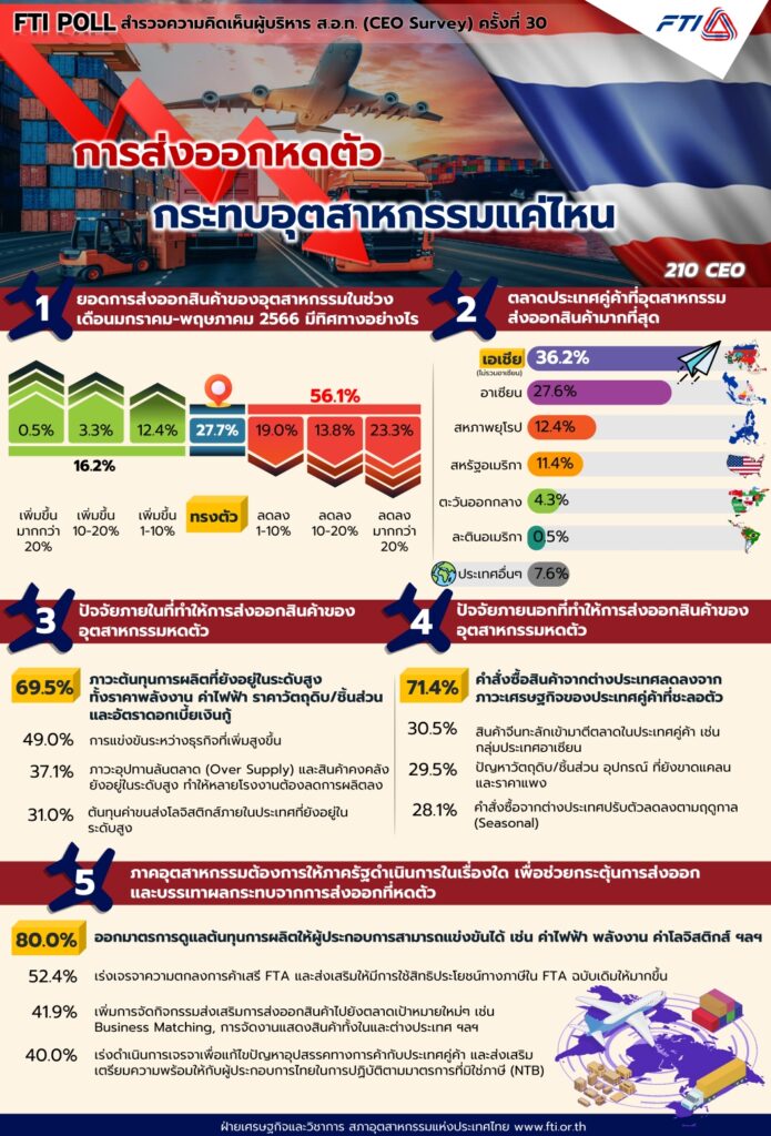 นายมนตรี มหาพฤกษ์พงศ์ รองประธานสภาอุตสาหกรรมแห่งประเทศไทย (ส.อ.ท.) เปิดเผยผลการสำรวจ FTI Poll ในเดือนมิ.ย. 2566 หัวข้อ “การส่งออกหดตัว กระทบอุตสาหกรรมแค่ไหน” หลังการส่งออกของไทยส่งสัญญาณหดตัวเป็นเดือนที่ 8 ติดต่อกัน โดยมีมูลค่าการส่งออกเดือน พ.ค. 2566 ที่ 24,340.9 ล้านดอลลาร์ฯ ติดลบ 4.6% จากช่วงเดียวกันของปีก่อน ขณะที่ 5 เดือนแรกปีนี้ มีมูลค่า 116,344.2 ล้านดอลลาร์ฯ ลดลง 5.1%