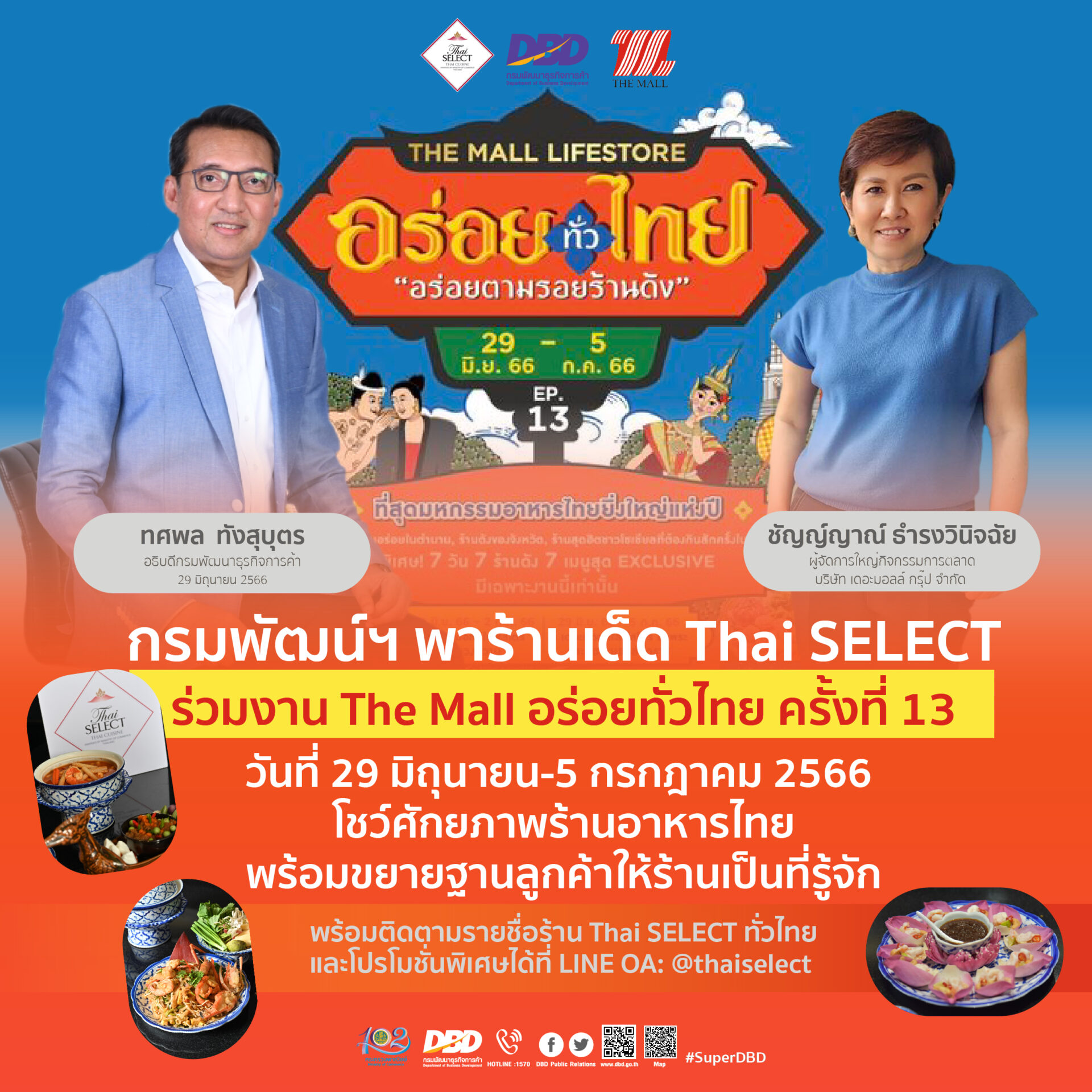 นายทศพล ทังสุบุตร อธิบดีกรมพัฒนาธุรกิจการค้าเปิดเผยว่า กรมพัฒนาธุรกิจการค้าร่วมกับบริษัท เดอะมอลล์ กรุ๊ป จำกัด เดินหน้าส่งเสริมร้านอาหารไทยที่อยู่ในการส่งเสริมของกรมฯ ที่ได้รับตราสัญลักษณ์ Thai SELECT พร้อมเปิดพื้นที่เข้าร่วมจัดแสดงและจำหน่ายอาหารในห้างสรรพสินค้าเดอะมอลล์ทั้ง 3 แห่งทั่วประเทศ ในงาน “The Mall อร่อยทั่วไทย ครั้งที่ 13” ระหว่างวันที่ 29 มิถุนายน – 5 กรกฎาคม 2566 เพื่อประชาสัมพันธ์ให้ผู้บริโภครับรู้ รับทราบและเห็นถึงศักยภาพของอาหารไทยภายใต้ตราสัญลักษณ์ Thai SELECT