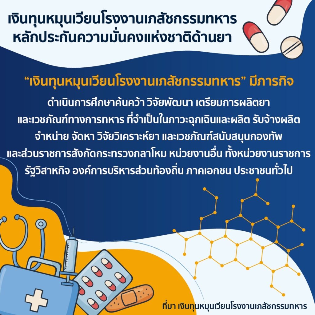 29 มิ.ย. – “เป็นหลักประกันหนึ่งของความมั่นคงแห่งชาติด้านยา” คือวิสัยทัศน์ของ “เงินทุนหมุนเวียนโรงงานเภสัชกรรมทหาร” ซึ่งเป็นหนึ่งใน “ทุนหมุนเวียน” ภายใต้การกำกับดูแลของระบบการบริหารทุนหมุนเวียน ประเภทเพื่อการจำหน่ายและผลิต ดำเนินการโดยโรงงานเภสัชกรรมทหาร ศูนย์การอุตสาหกรรมป้องกันประเทศและพลังงานทหาร