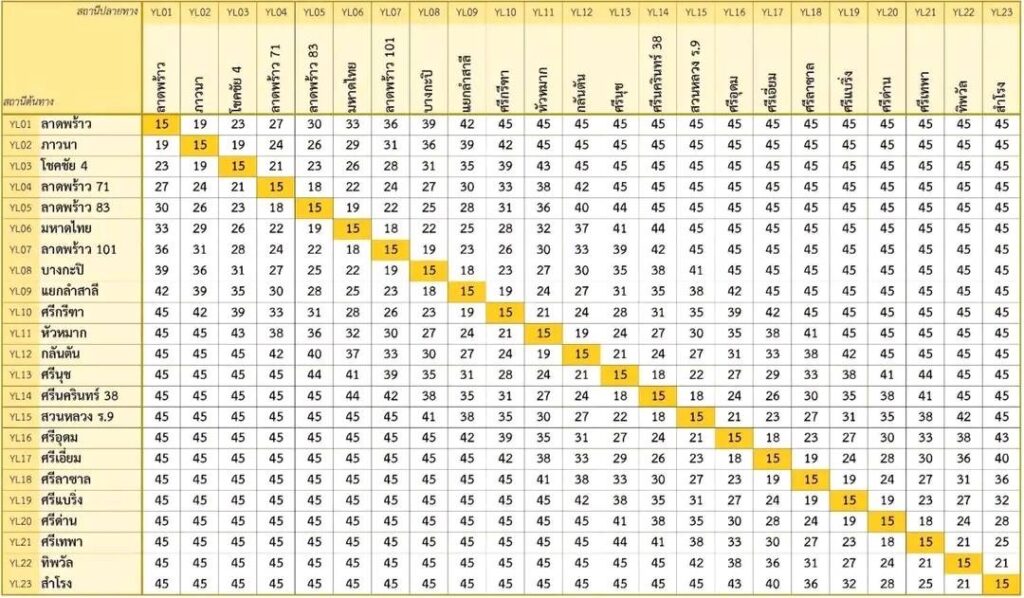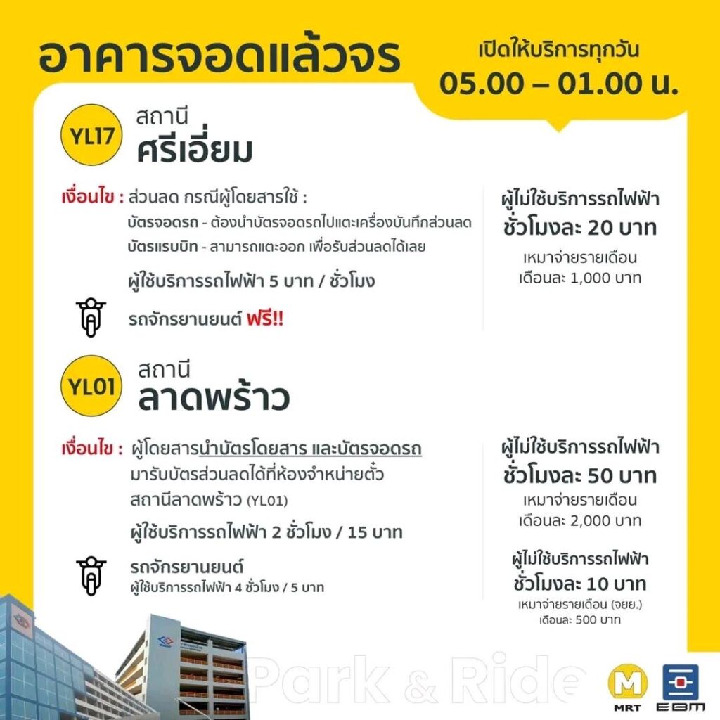 โดยอัตราค่าจอดรถอาคารจอดรถสถานีลาดพร้าว คิดอัตราค่าจอดรถยนต์ 2 ชั่วโมง 15 บาท (กรณีไม่ใช้บริการรถไฟฟ้า ชั่วโมงละ 50 บาท)ส่วนอาคารจอดรถสถานีศรีเอี่ยม คิดอัตราค่าจอดรถยนต์ ชั่วโมงละ 5 บาท (กรณีไม่ใช้บริการรถไฟฟ้า ชั่วโมงละ 20 บาท).-สำนักข่าวไทย